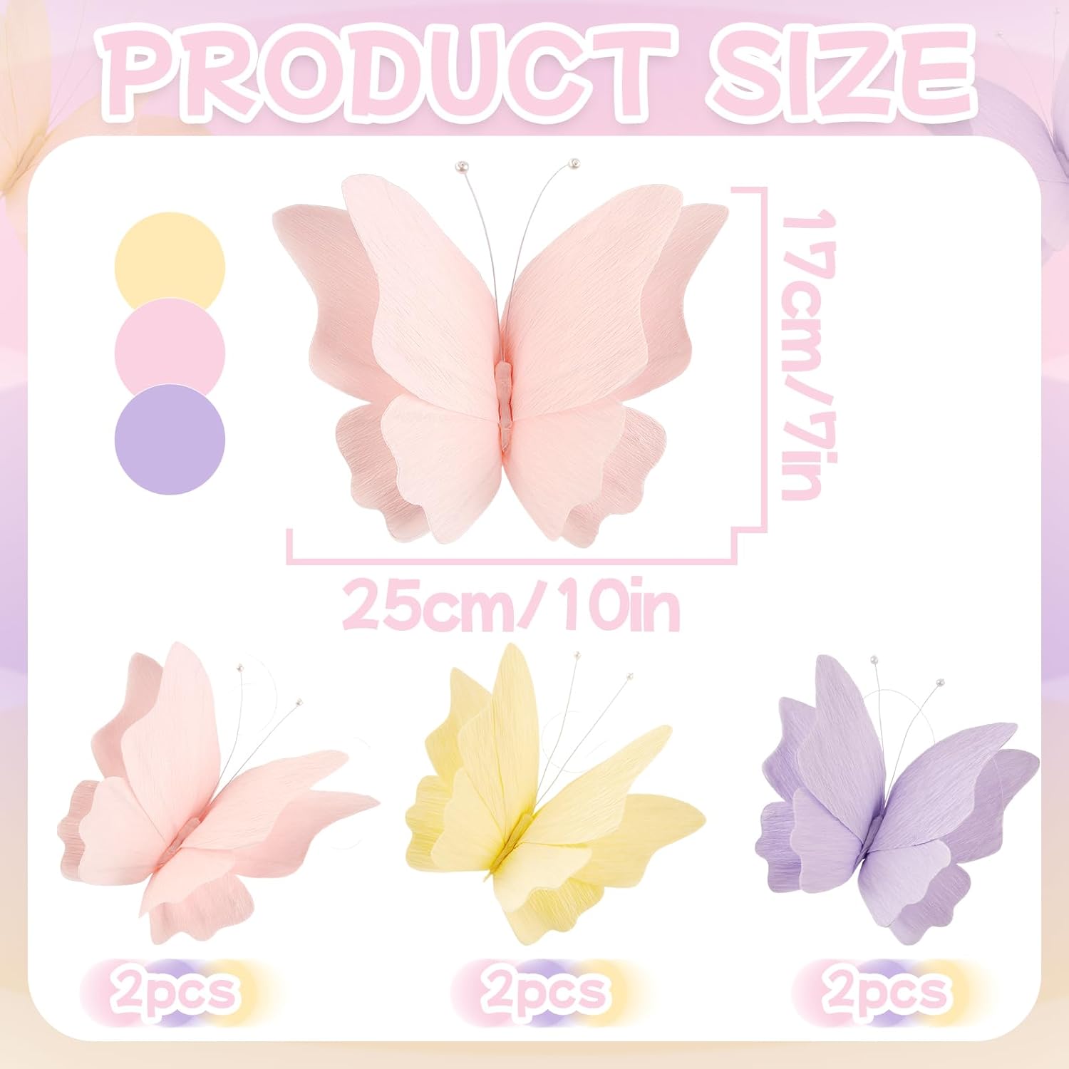 - 🌈Versatile decoration—Set includes 6 butterflies in trending pastel purple, pink and yellow create a gentle and elegant atmosphere, which can be mixed and matched to complement birthday party decorations, spring themes, or gender-reveal events.
