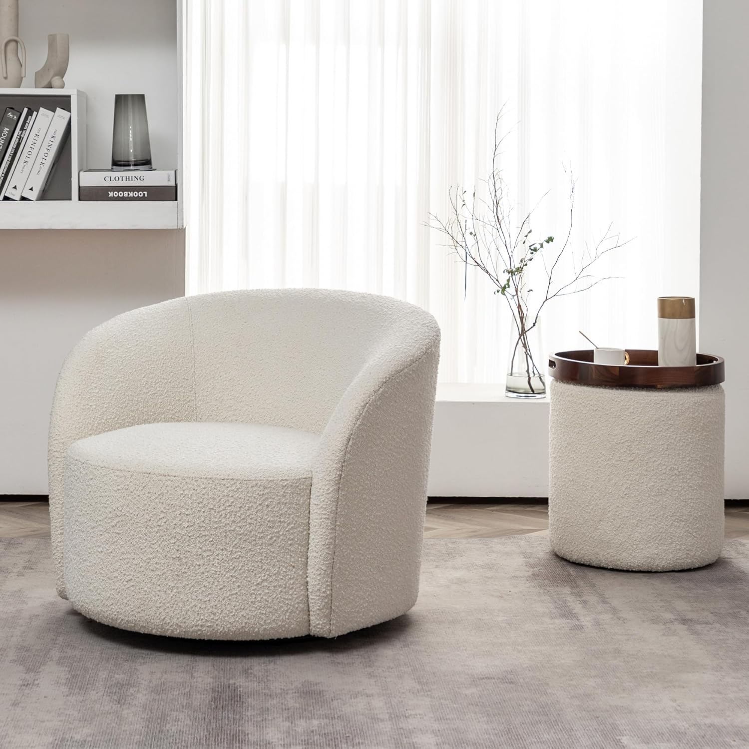 - Package Includes: 1 x boucle swivel barrel chair (Cream, Dimensions: 32.7'' D X 34'' W X 28.5'' H, no assembly); 1 x boucle upholstered ottoman (Cream, Dimensions: 18"D x 18"W x 18.3"H, no assembly). No throw pillow includes in this living room boucle chair ottoman furniture set.
