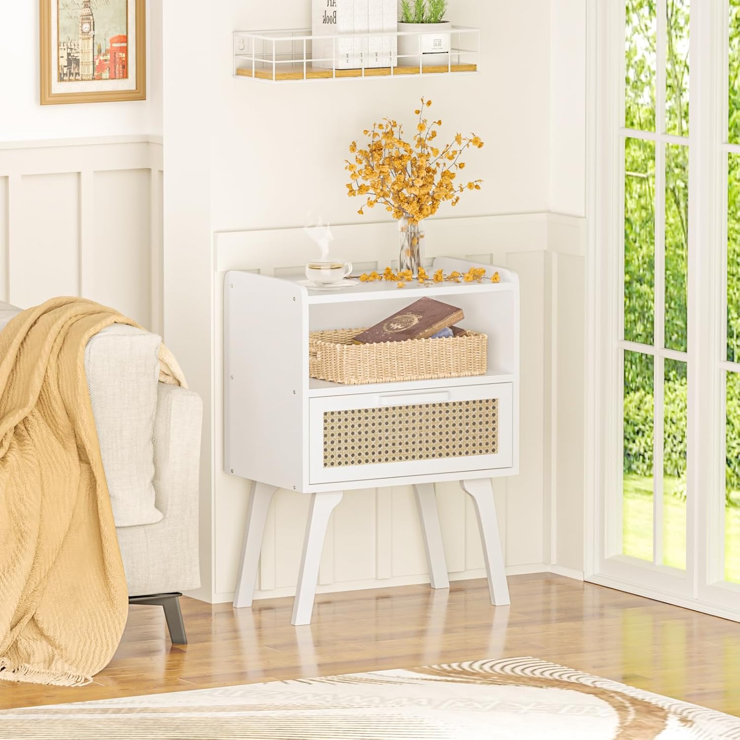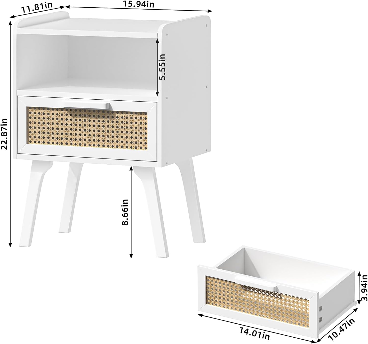 Lerliuo Rattan Nightstand, Bedside Table with Drawer Open Shelf, Cane Accent Side End Table with Solid Wood Legs, White Mid Century Night Stand for Bedroom, Dorm and Small Spaces