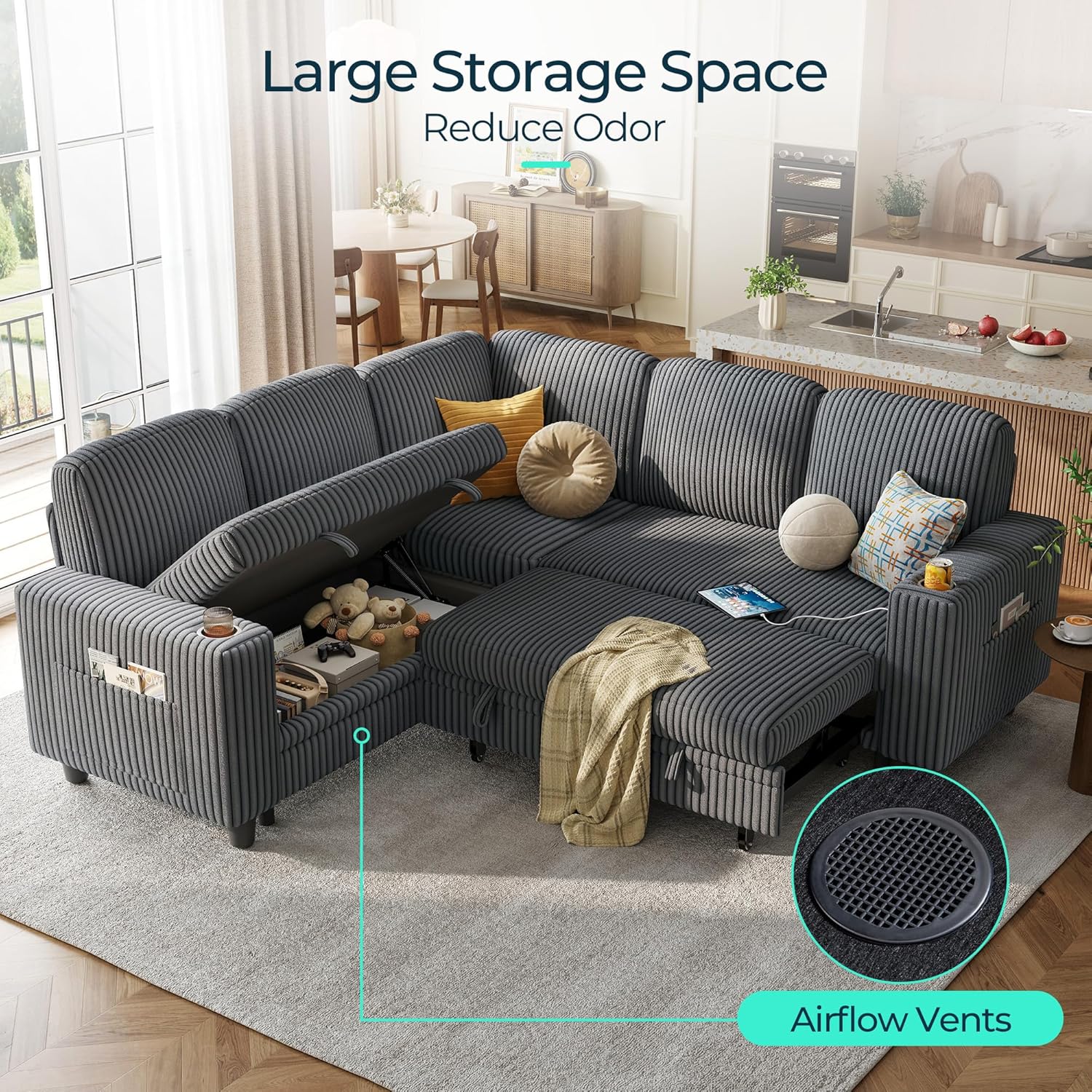 LINSY HOME Sectional Sleeper Sofa with Pull Out Couch Bed - Convertible Plush Corduroy Cloud Couch with Storage Chaise & USB Charging, Comfy L Shaped Modular Couches for Living Room Apartment (Grey)