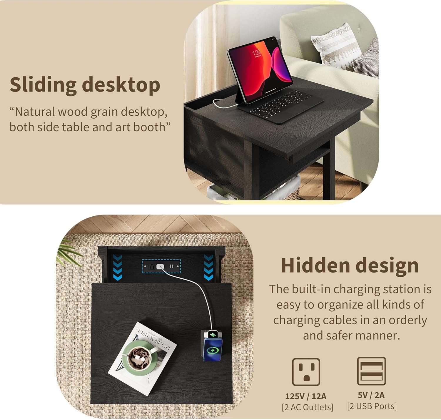 - 【Innovative Sliding Top 】This side table features a smooth-sliding top that reveals a hidden charging station.open shelves for books, remotes, and décor, keeping your space neat and accessible.