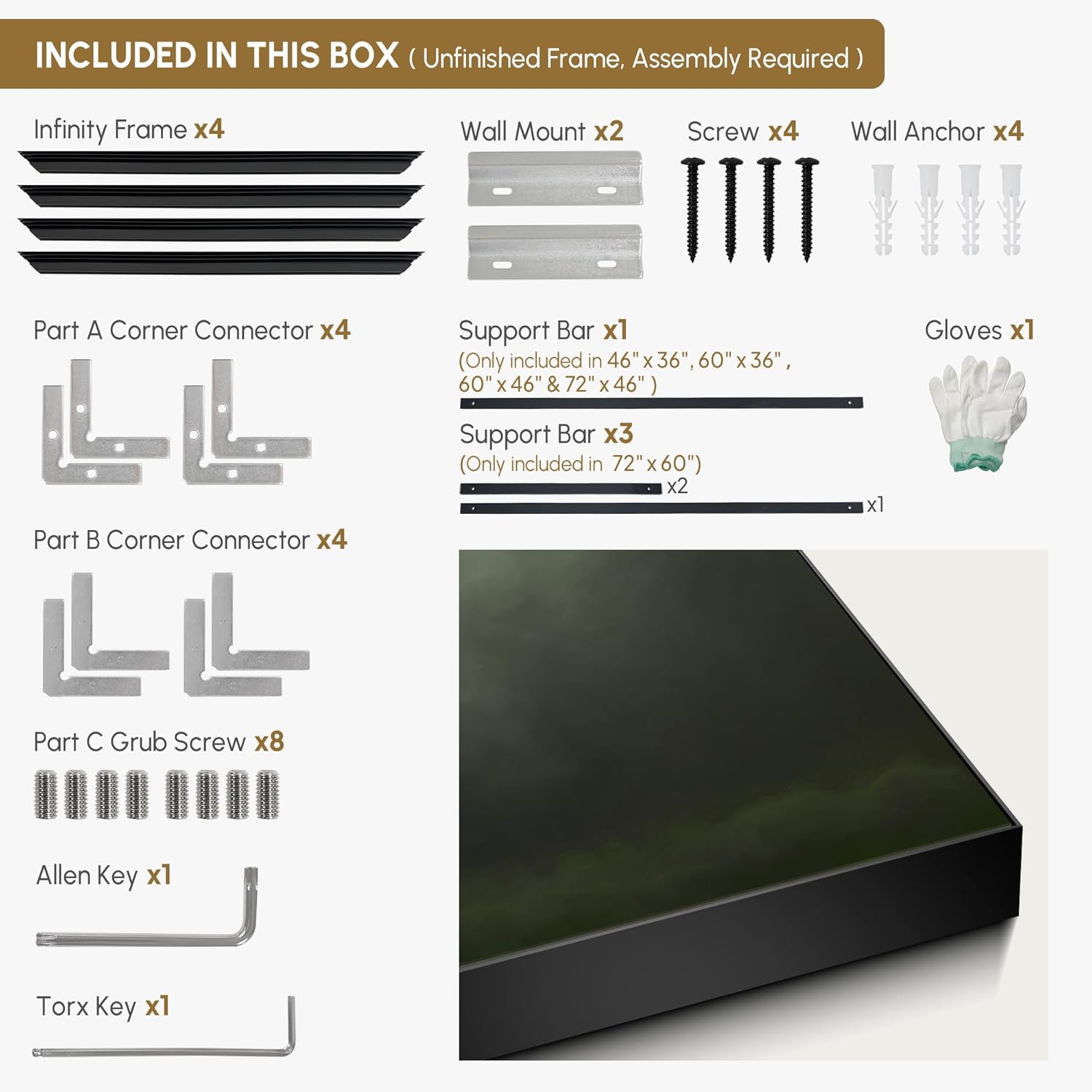 - Assembly Required: The artwork comes with the frame components unassembled. Don’t worry — setup is straightforward and tool-friendly. For best results and accurate alignment, we recommend two people to ensure a smooth assembly and a stable, secure wall mount.