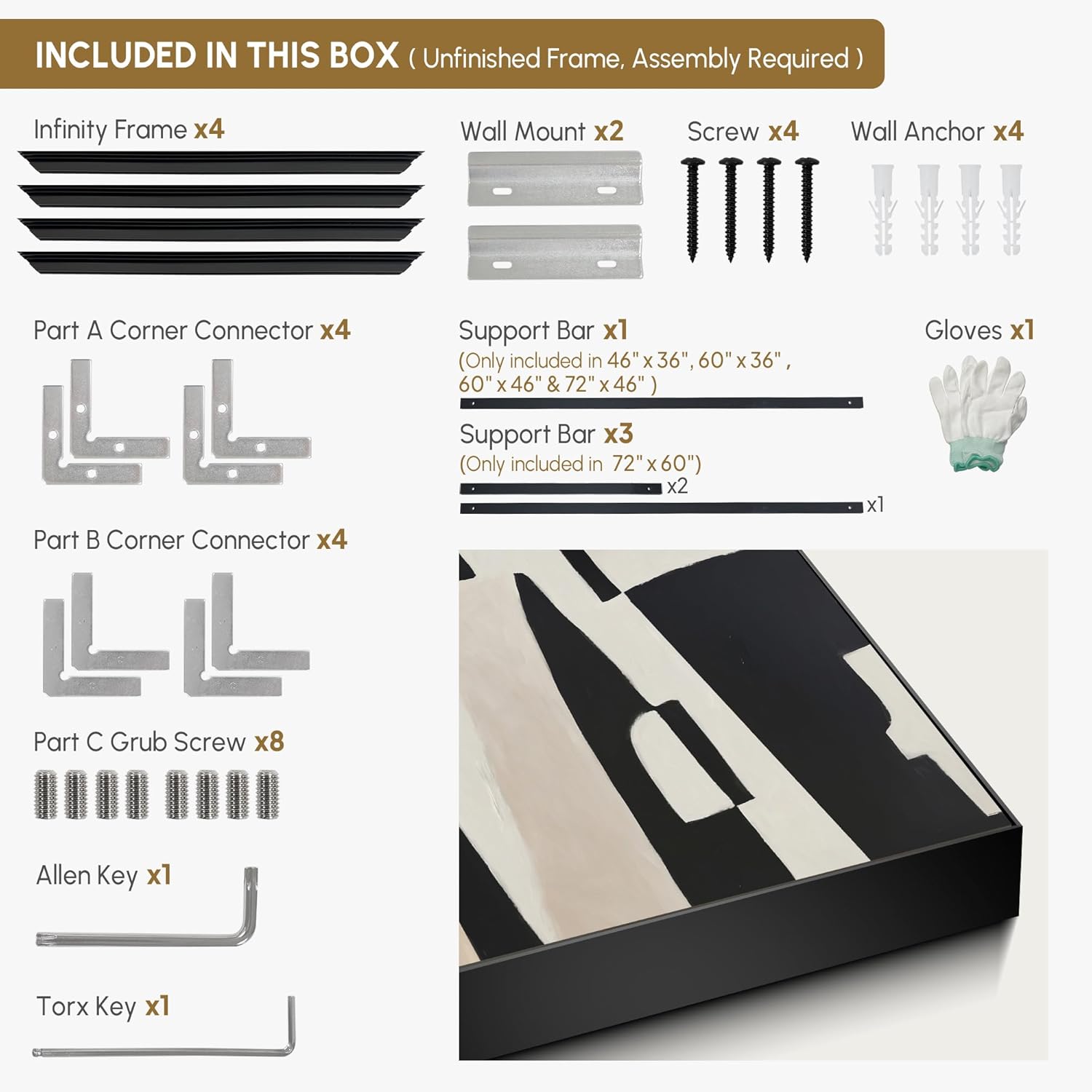 - Assembly Required: The artwork comes with the frame components unassembled. Don’t worry — setup is straightforward and tool-friendly. For best results and accurate alignment, we recommend two people to ensure a smooth assembly and a stable, secure wall mount.