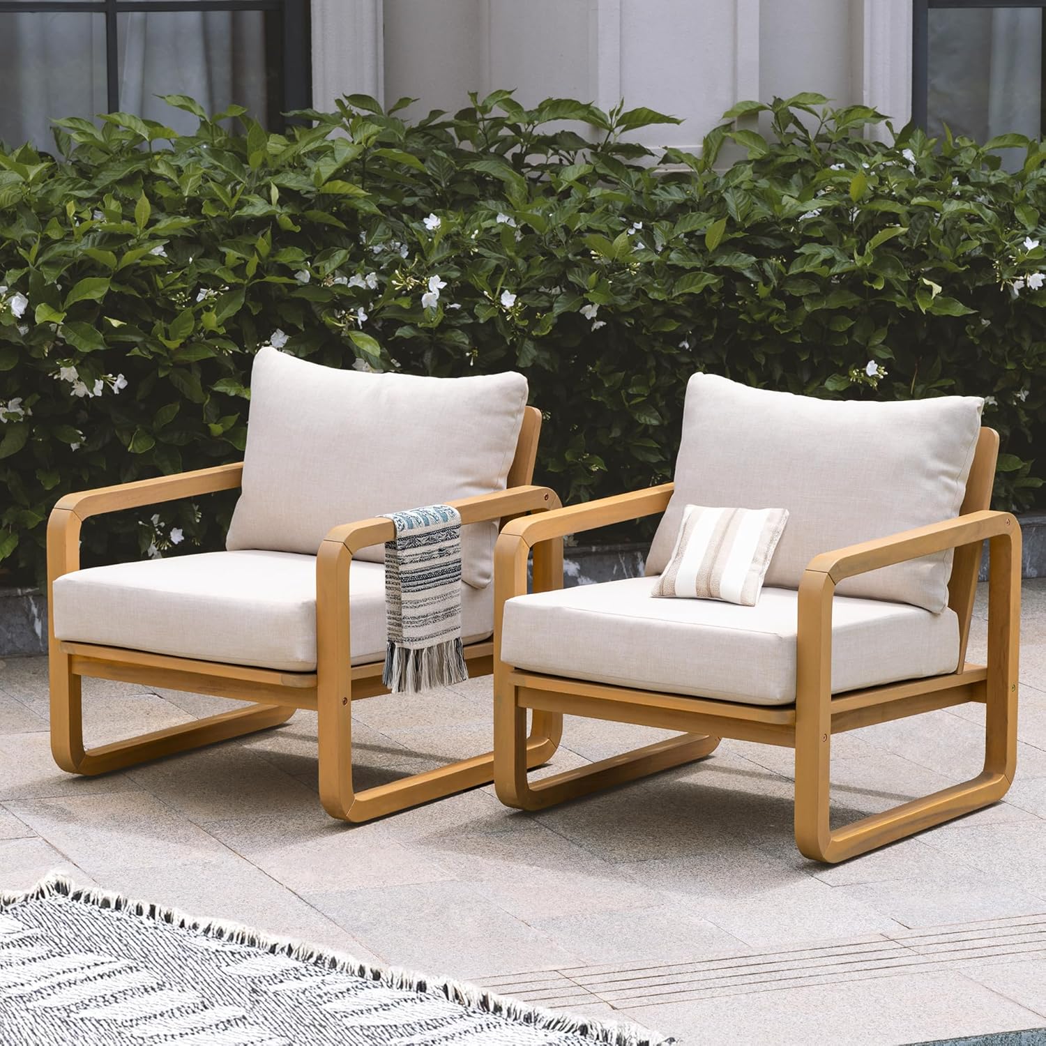 - STURDY WOODEN FRAME – BUILT TO LAST: Each chair is constructed from solid acacia wood with a sleek curved base, offering stability and long-term durability for any patio or outdoor setup