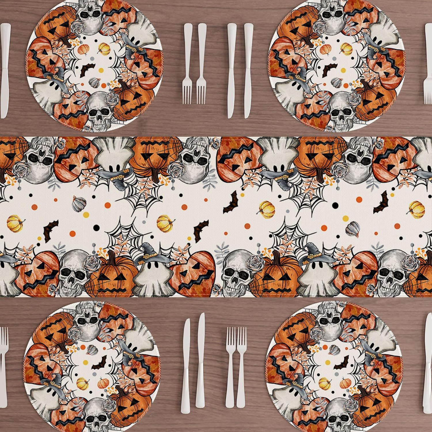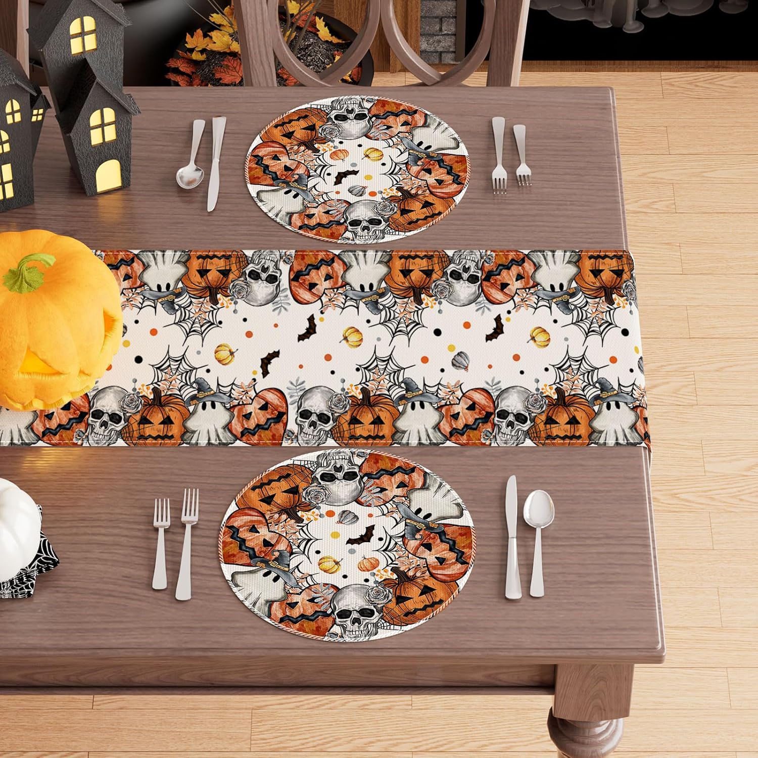 XCHI Spooky Skeleton Ghost Pumpkin Halloween Round Placemats Set of 4 Table Mats for Party Home Kitchen Dining Table Decorations 14x14 Inch