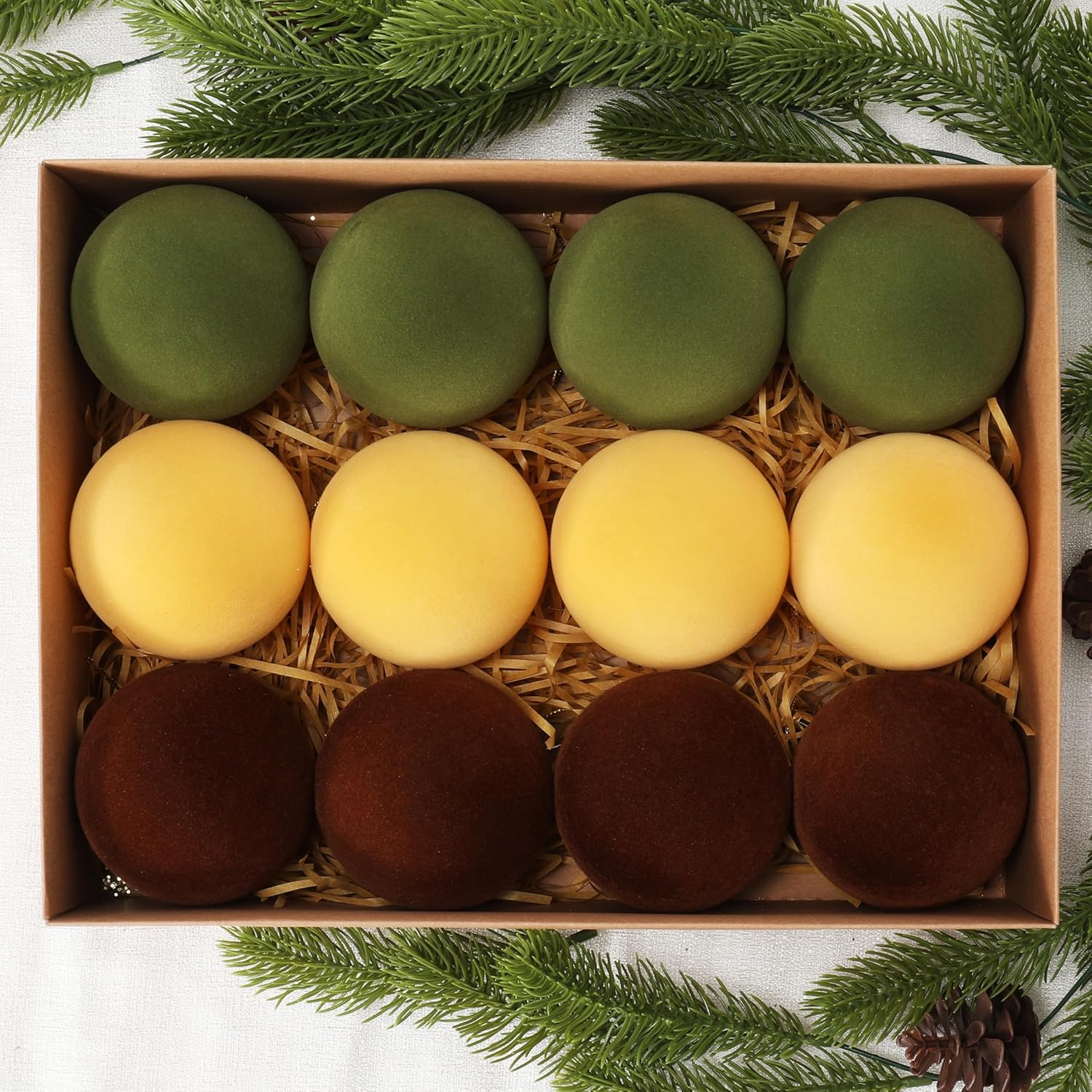 - Set of 12 Velvet Christmas Balls – 3.15" Diameter: This beautifully curated set includes 12 Christmas balls, each measuring 3.15 inches (8 cm). Featuring a mix of solid-colored velvet ornaments and balls with hand-painted accents, this set adds rich texture and visual variety to your holiday decorations.