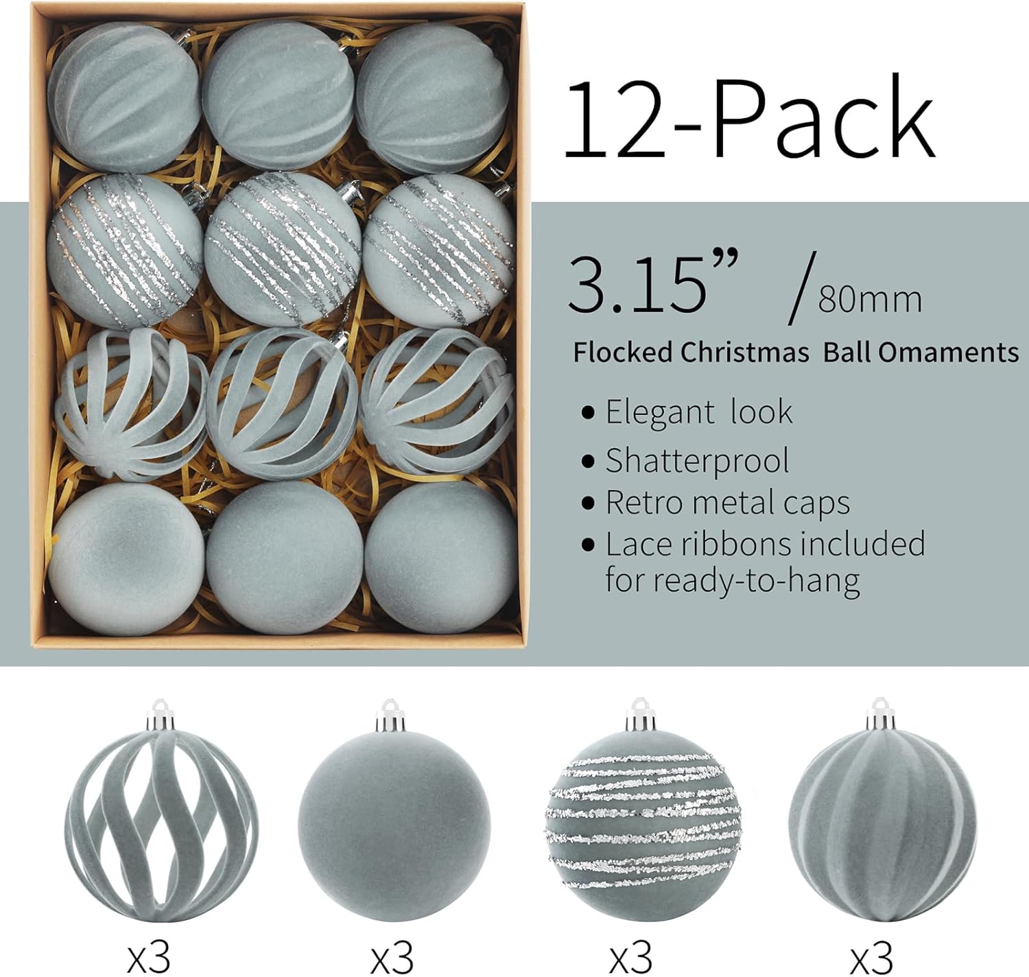 Christmas Ornaments Set of 12, 3.15" Flocked Velvet Balls with Hand Painted Designs, Dusty Blue Elegant Christmas Tree Decorations in Gift Box