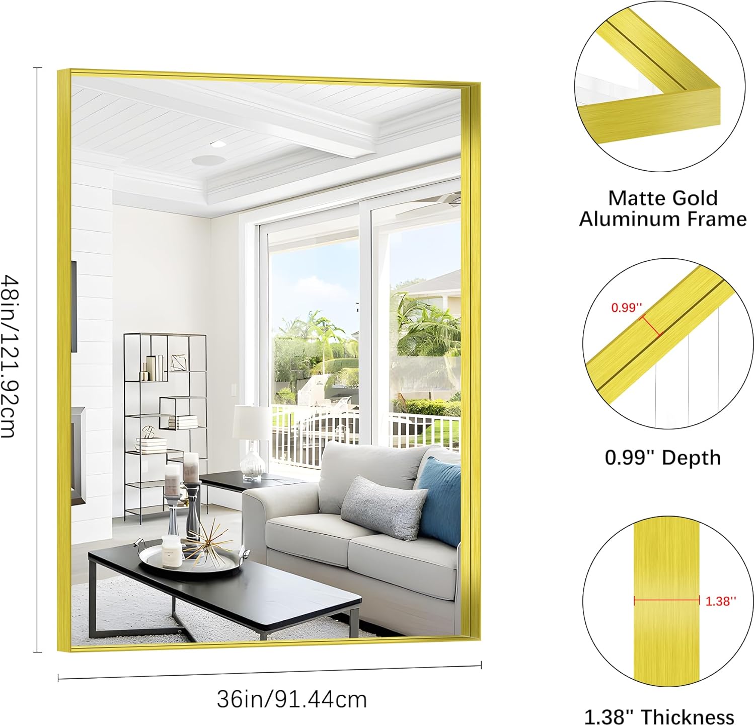- Sleek & Sturdy Aluminum Alloy Frame: This elegant gold bathroom mirror features a lightweight yet durable aluminum alloy frame, designed to resist deformation, chipping, and corrosion. The slim metallic profile adds a modern touch, elevating your space with a luxurious finish. Perfect as a wall-mounted or hanging mirror, it combines strength, style, and longevity