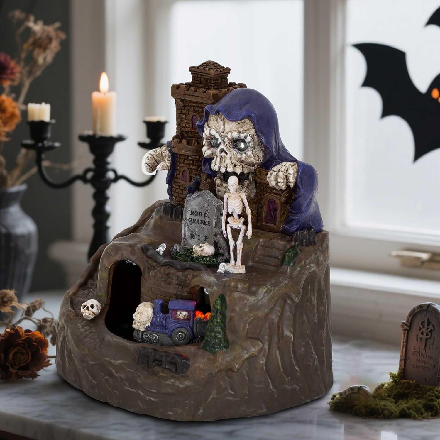 - This Halloween decoration resembles a haunted skull castle featuring glowing skulls, tombstones, a moving train, and additional mysterious elements, intricately detailed to enhance your seasonal decor.