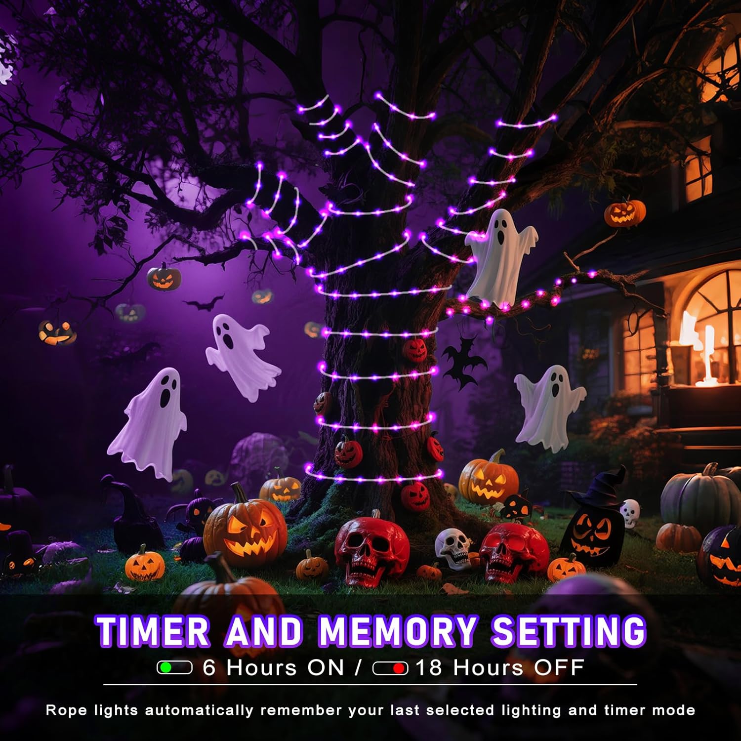 - 【Flexible and Timer】- The flexible purple Halloween lights allows you to bend the lights into various shapes to decorate any occasion. Easily wrap around trees, poles, fences, or furnitures. You can set timer, the string lights for outside will be 6 hours on and 18 hours off per day. Perfect for decorating both indoor spaces like living rooms and bedrooms.