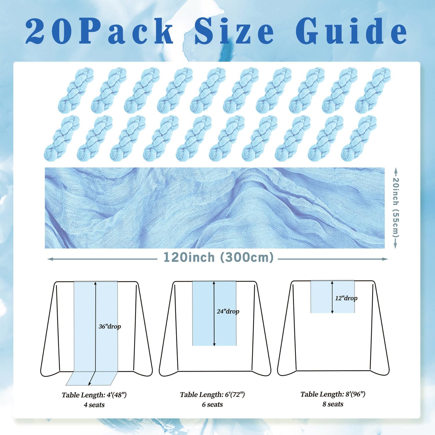 20 Pack Baby Blue Cheesecloth Table Runner 20 x 120 Inch Long Rustic Gauze Cheese Cloth Table Runner for Wedding 10FT Bridal Baby Shower Table Decorations Boho Fabric Sheer Birthday Party Table Decor