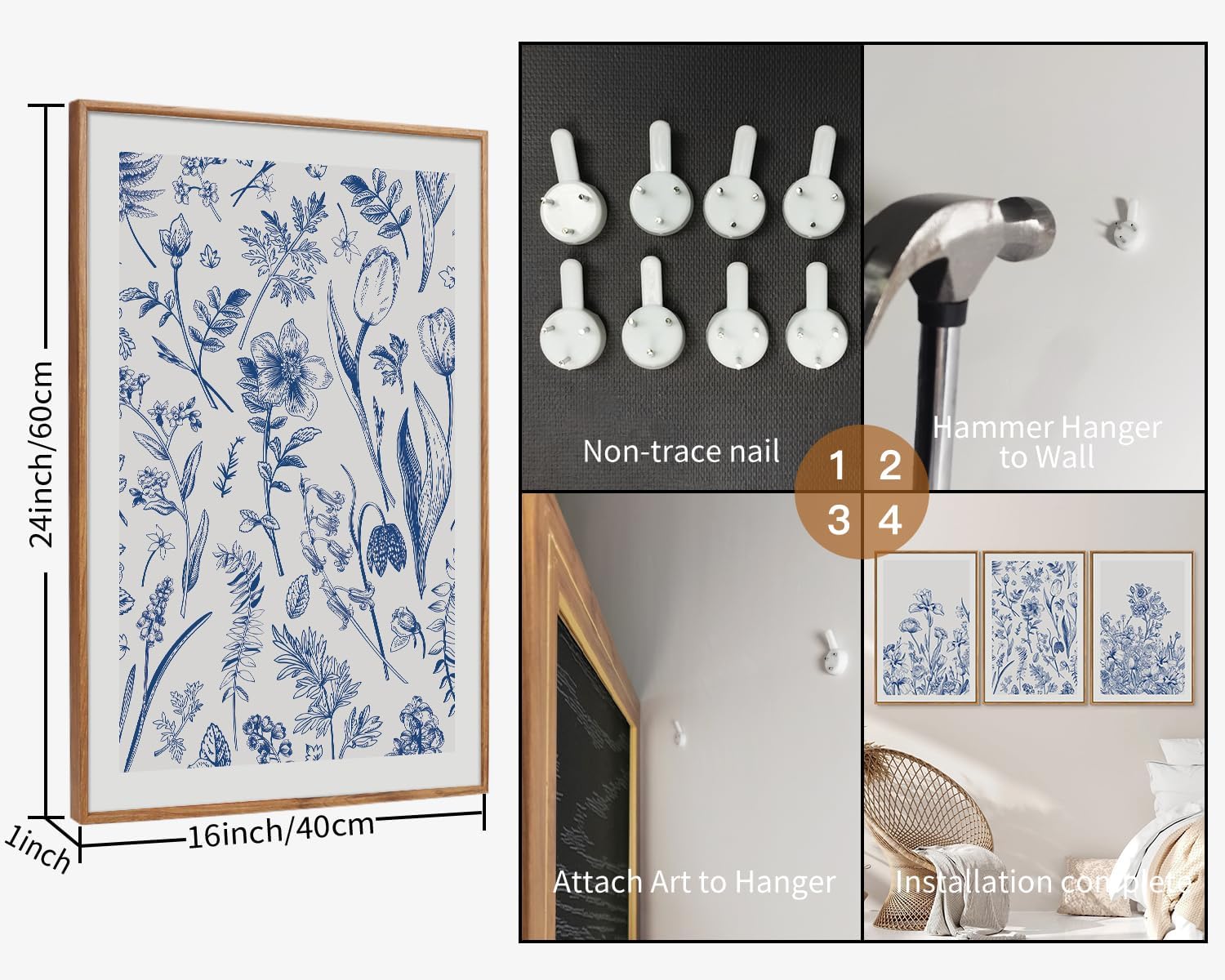 SIGNINART Classic Chinoiserie Botanical Framed Canvas Wall Art, Blue and White Floral Wall Decor, Minimalist Flower Artwork, Navy Blue Wildflower Art Painting for Bedroom Living Room Office 24"x36"x3