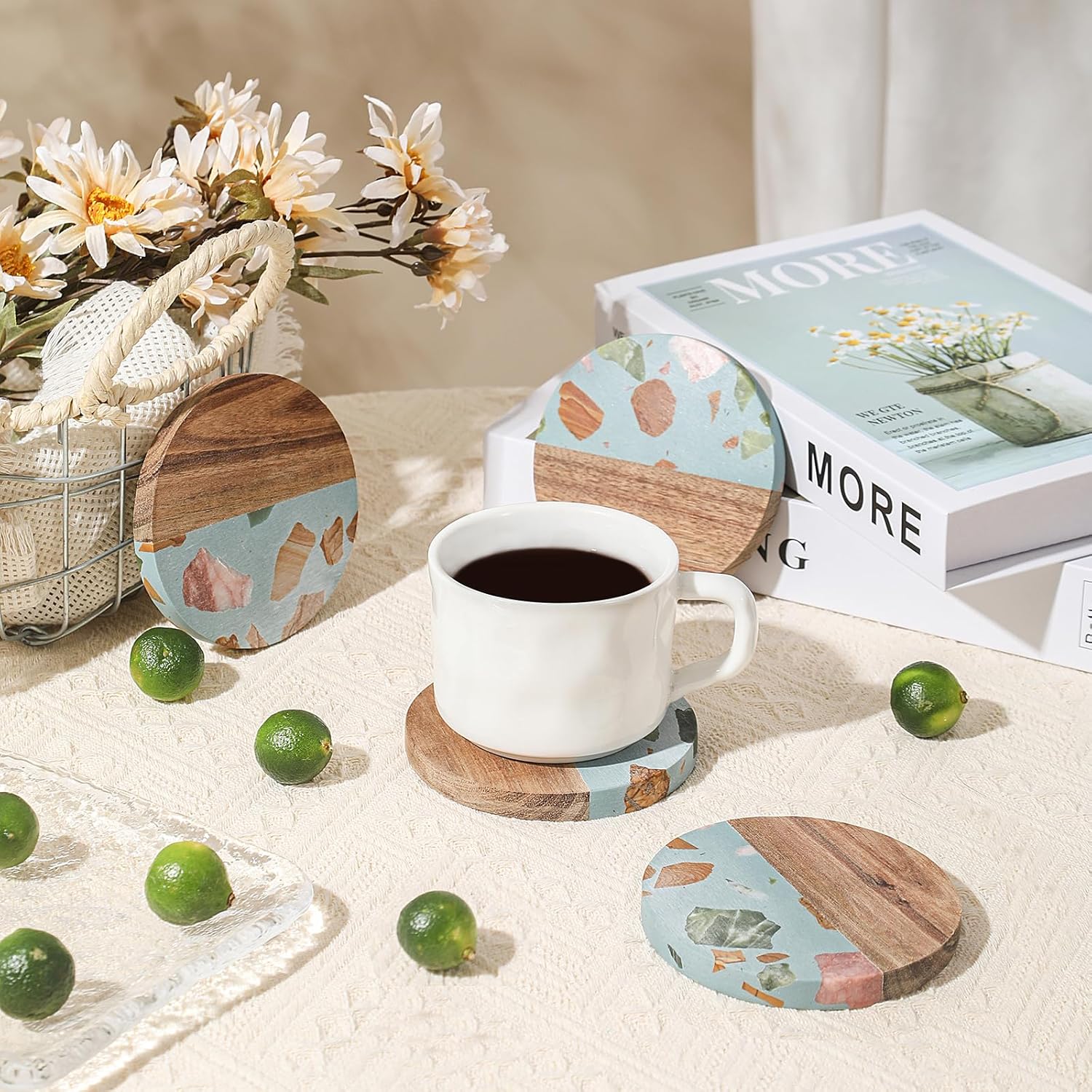 Drink Acacia Wood-Marble Coasters Set of 4,Cup Coaster for Coffee,Beverage,Cute Modern Cool Coasters for Home Decor,Table Desk Coaster Set for Housewarming,Living Room Decor (Green-Wooden)