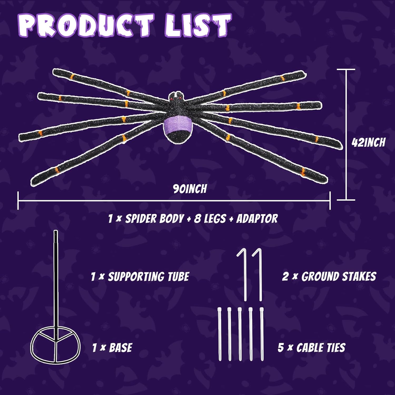 - ๐ง Effortless Setup Halloween Decorations: Package includes: 5ft power cord, cable ties, ground stakes, support tube & baseโno tools needed.Assemble this massive scary spider (66" x 42" x 22") in minutes!
