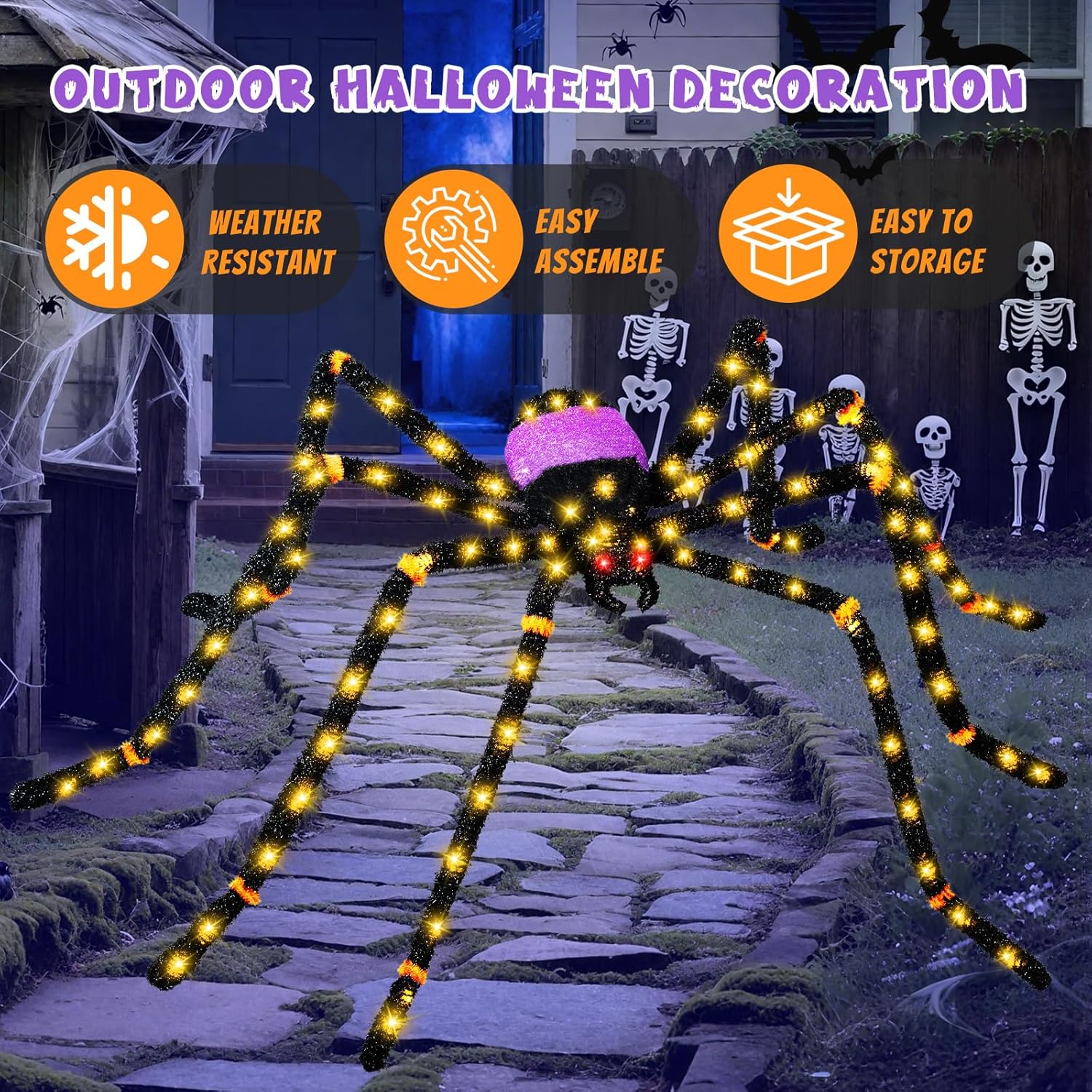 - ๐ก Pre-Lit Light Up Spider: This creepy Halloween decorations with brighter 100 LED cast haunting glows across freely pose bendable glow legs and scary glowing red eyes, creating bone-chilling spooky decor that transforms any space into a haunted zone after dark.