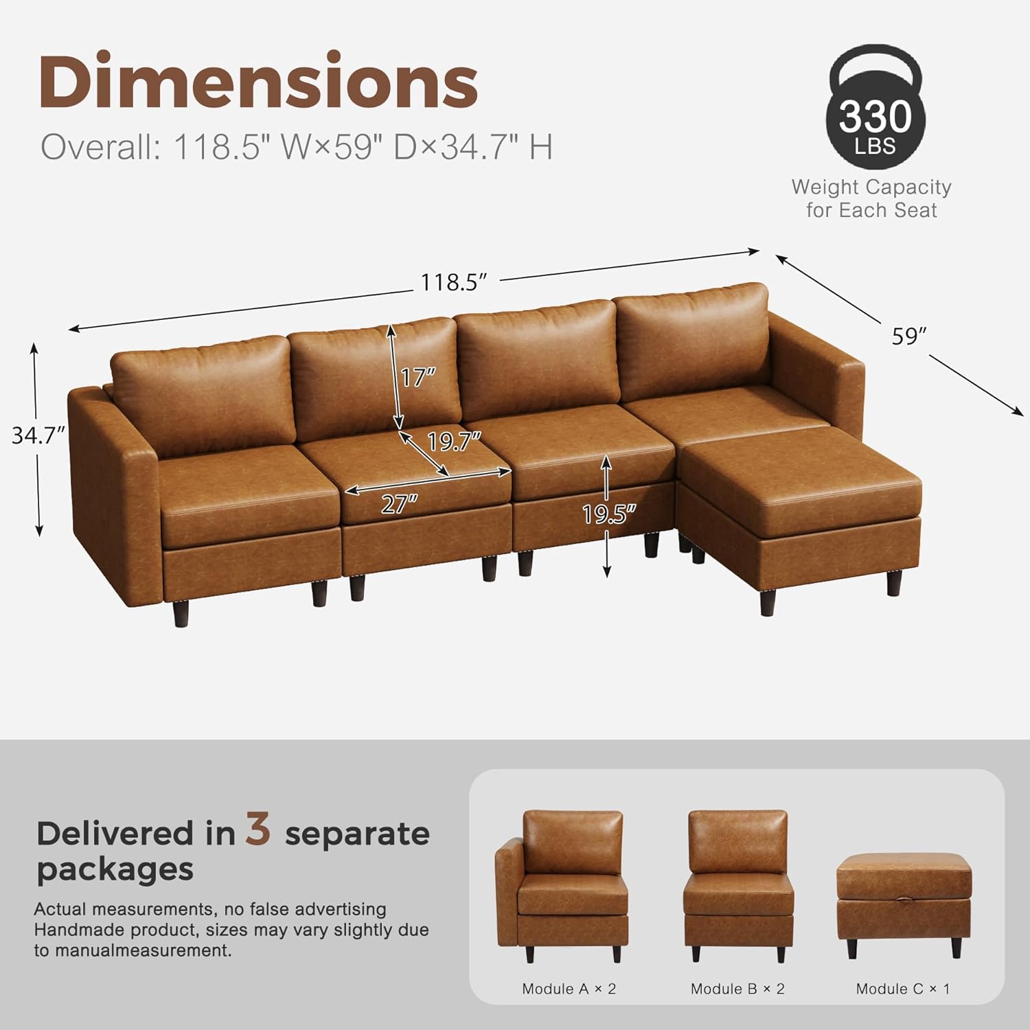 118.5" Faux Leather Modular Sectional Sofa, L Shaped Couch Set for Living Room, 5-Seater Comfy Cloud Couches with Movable Storage Ottoman,DIY Combination - Brown