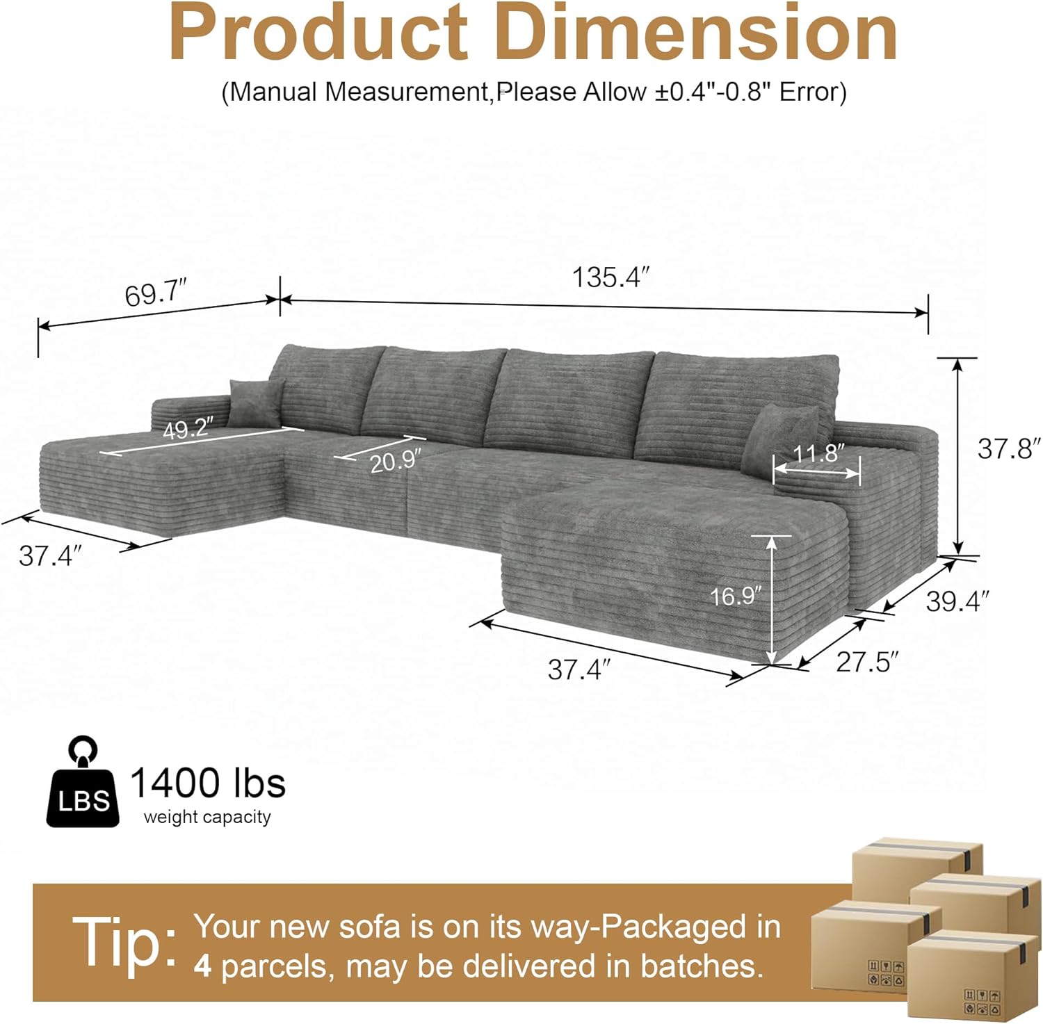 136" Sectional Couches for Living Room Modern Modular Sofa with L-Shape Couchs Upholstered Boneless Couch Deep Seat Sectional Couch with Chaise (Grey, Left Facing Chaise+3Seaters+Ottoman)