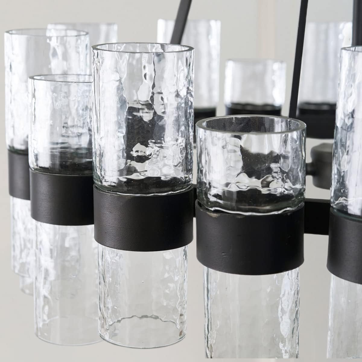 - [Premium Matrial] Made from recycled glass and a durable steel-brass frame, this chandelier showcases glass cylinders in bronzed-metal sleeves. The design creates an industrial glow while maintaining an elegant aesthetic