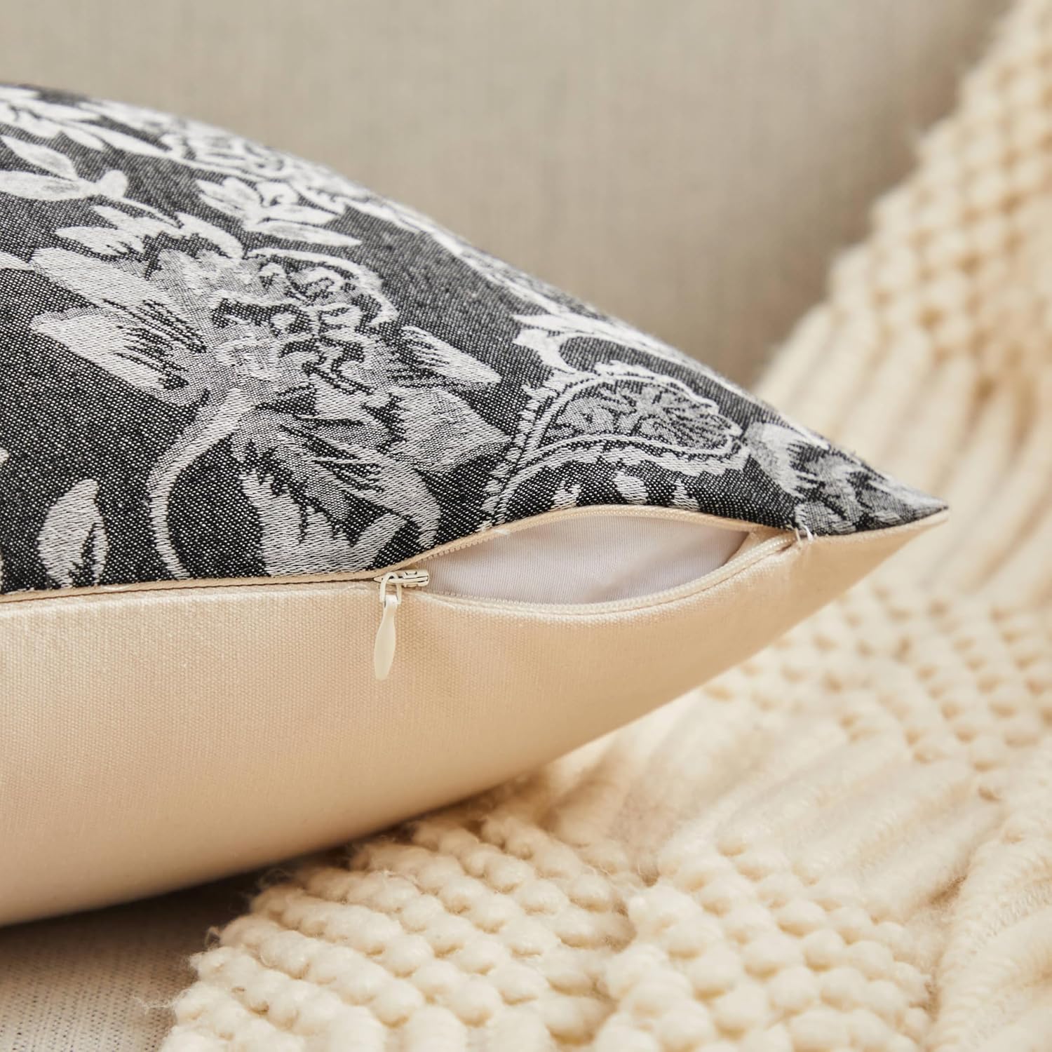 Floral Jacquard Throw Pillow Covers Set of 2, Background/Charcoal 16x16 Inch, Farmhouse Decorative Cotton Dark Grey Cushion Covers for Sofa Bed Living Room Home Decor
