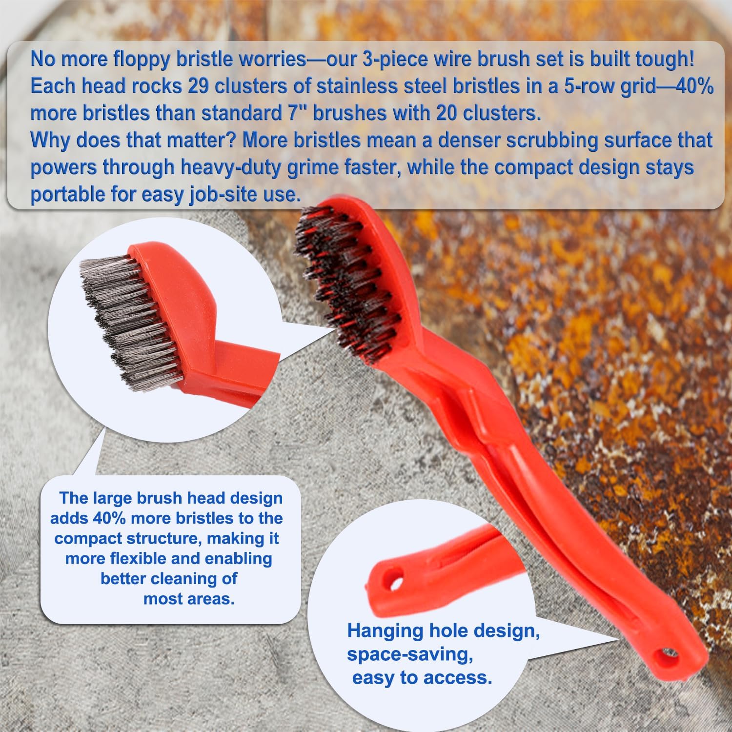 - 40% Denser Bristles + Ultra-Stiff – Solves "Too Soft" Issues – Each brush has 29 stainless steel bristle clusters (vs. 20 in most 7" wire brushes), cutting through rust, grease, grime, and smoothing burrs with ease. Stiff, durable bristles resist bending, saving time and elbow grease on heavy-duty cleaning and deburring!