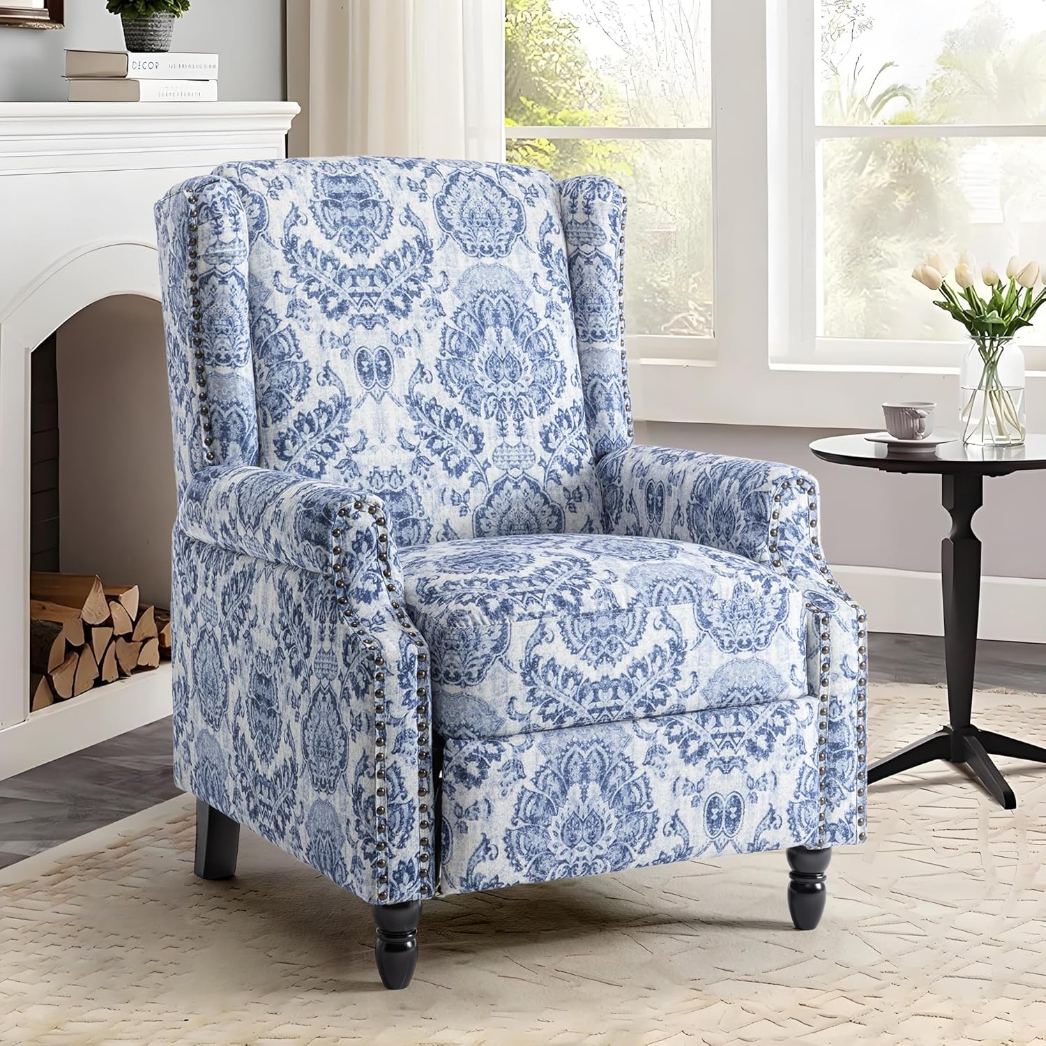 UIXE Floral Pushback Recliner Chair, Fabric Upholstered Armchair Push Back Accent Chair for Living Room, Rivet Trim Club Chair Home Theater Single Sofa Reading Seat - Navy Blue