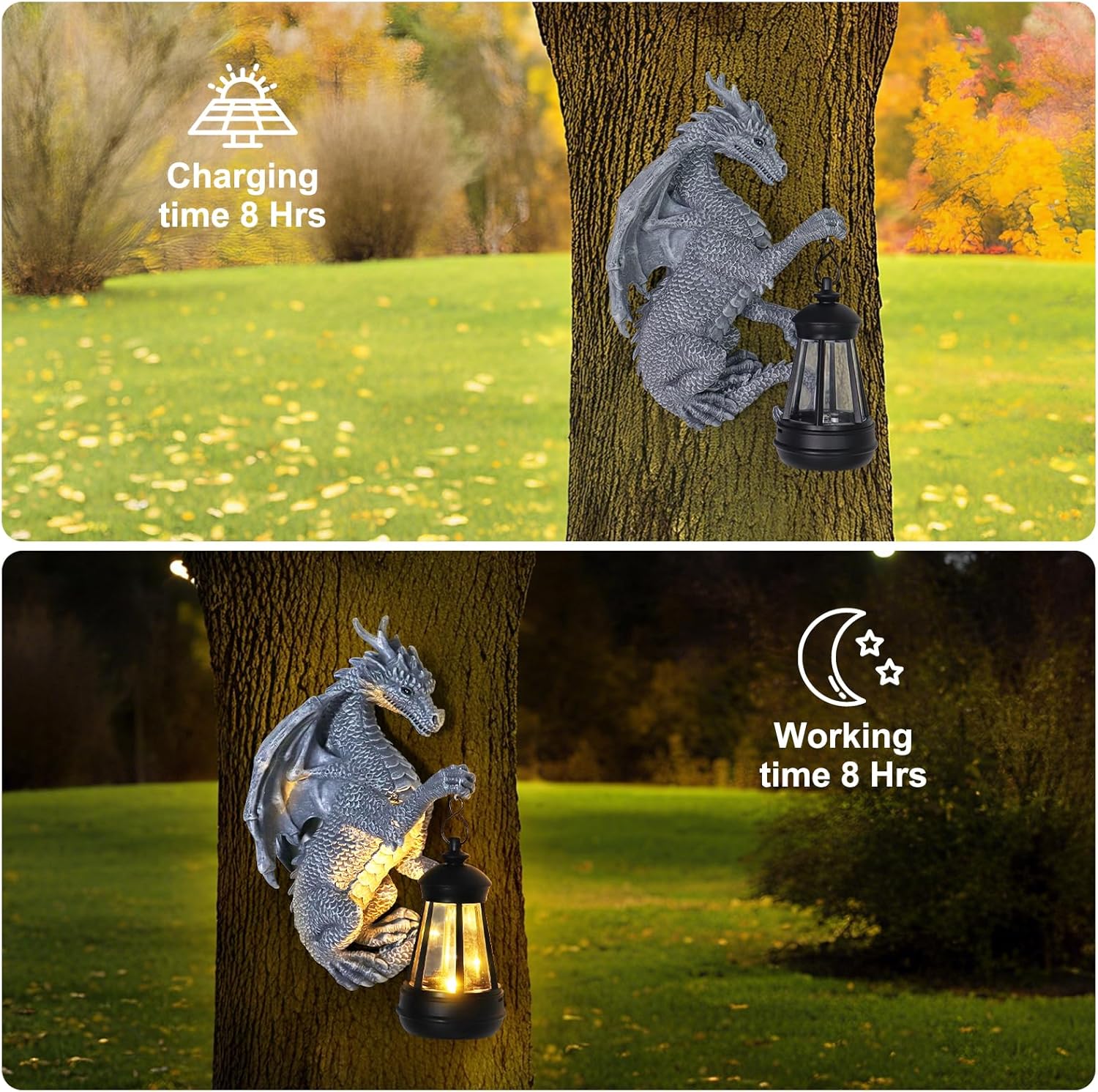 - Versatile dragon light for any outdoor spot! Hang this dragon wall decor on fences, pillars, porches, or trees—its back groove ensures secure placement, resisting wind. The solar-powered dragon light charges by day, glows bright all night, casting beautiful illumination. A functional dragon garden statue that shines as dragon wall art.