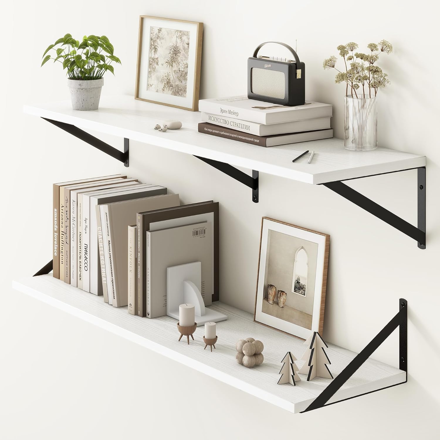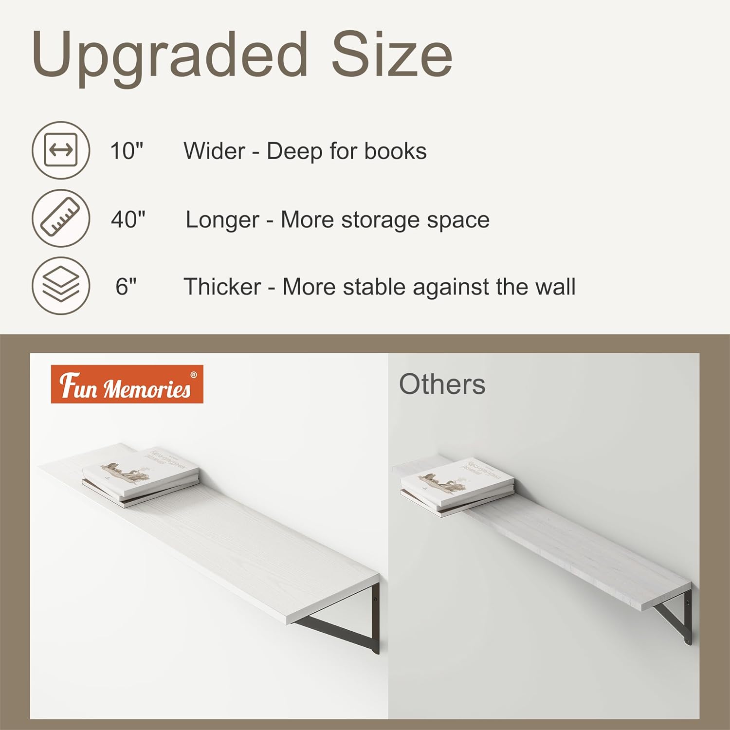 Fun Memories 40 Inch Floating Shelves, 10 Inch Deep Wall Shelf, 40 x 10 Floating Shelf Set of 2, White Wood Floating Shelf Wall Mounted, Large Kitchen Living Room Bedroom Storage Shelves