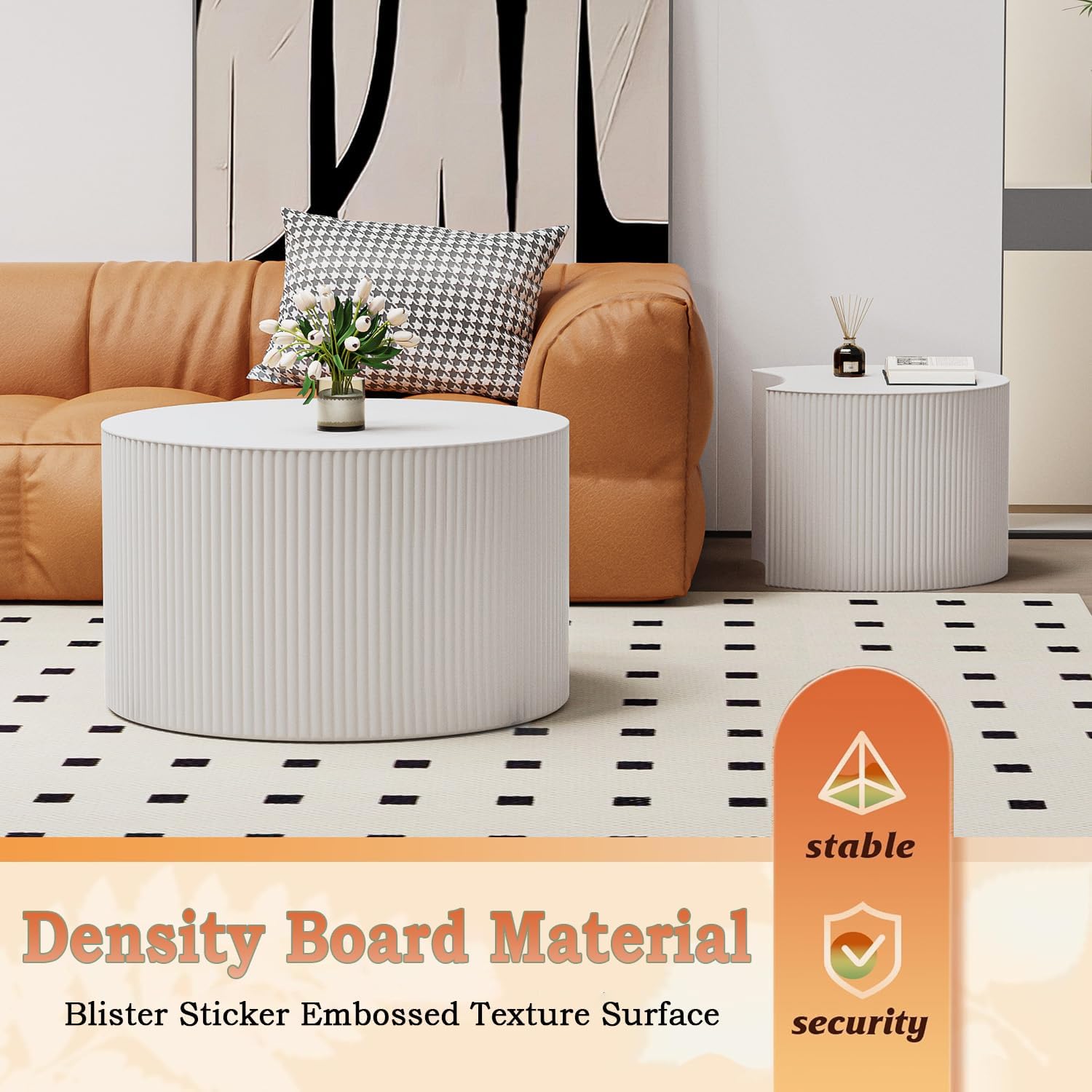 Round Nesting Coffee Table Modern Fluted Coffee Table Set of 2 Circle Drum Coffee Tables Small Round Accent Side End Table for Living Room No Assembly (White B 27in)