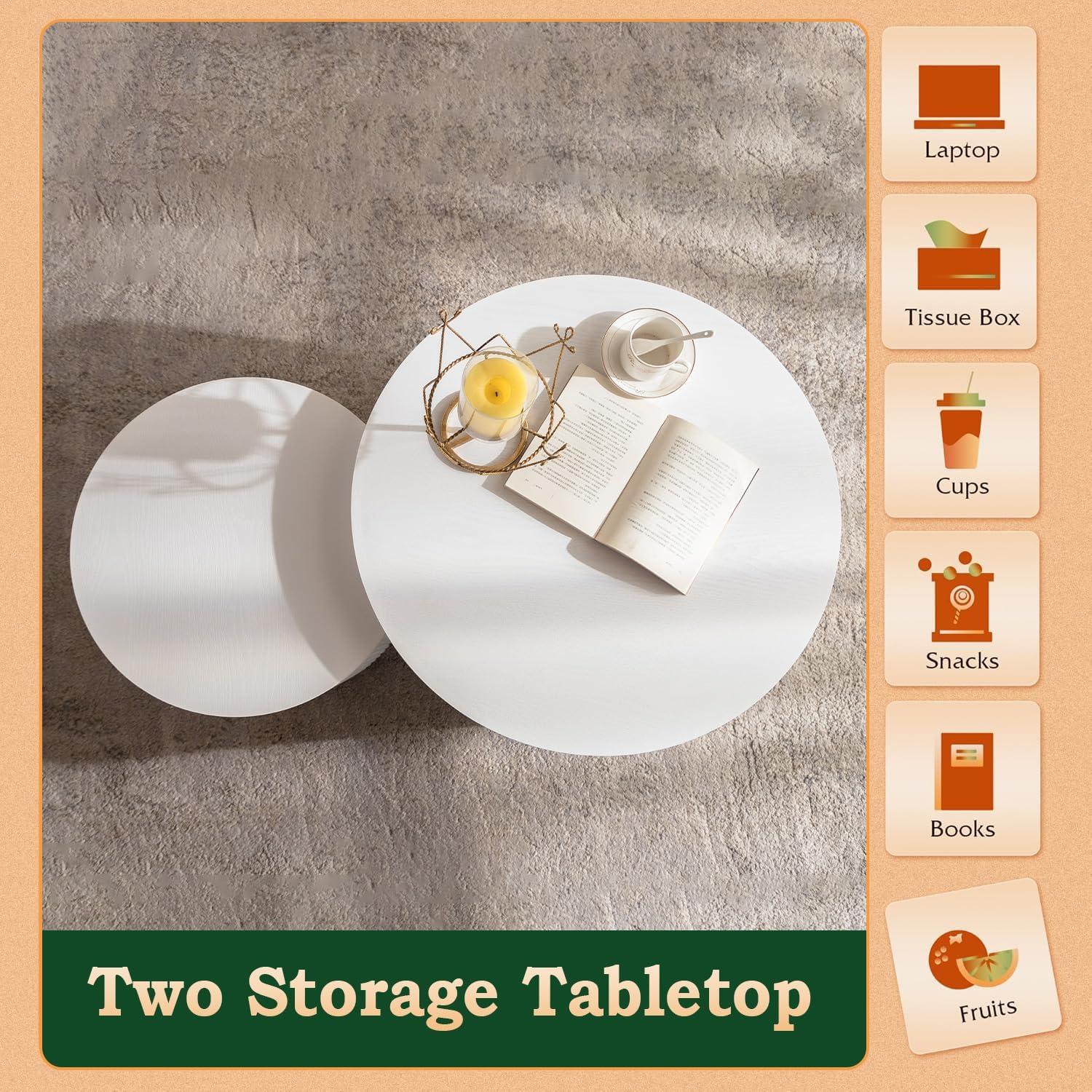 - Space-Saving Nesting Feature: Designed as a duo, the nesting coffee table round consists of one hollow large table and one solid smaller table. The smaller table conveniently fits under the larger one, optimizing space while offering flexible functionality. No assembly is needed—just unpack and use immediately.