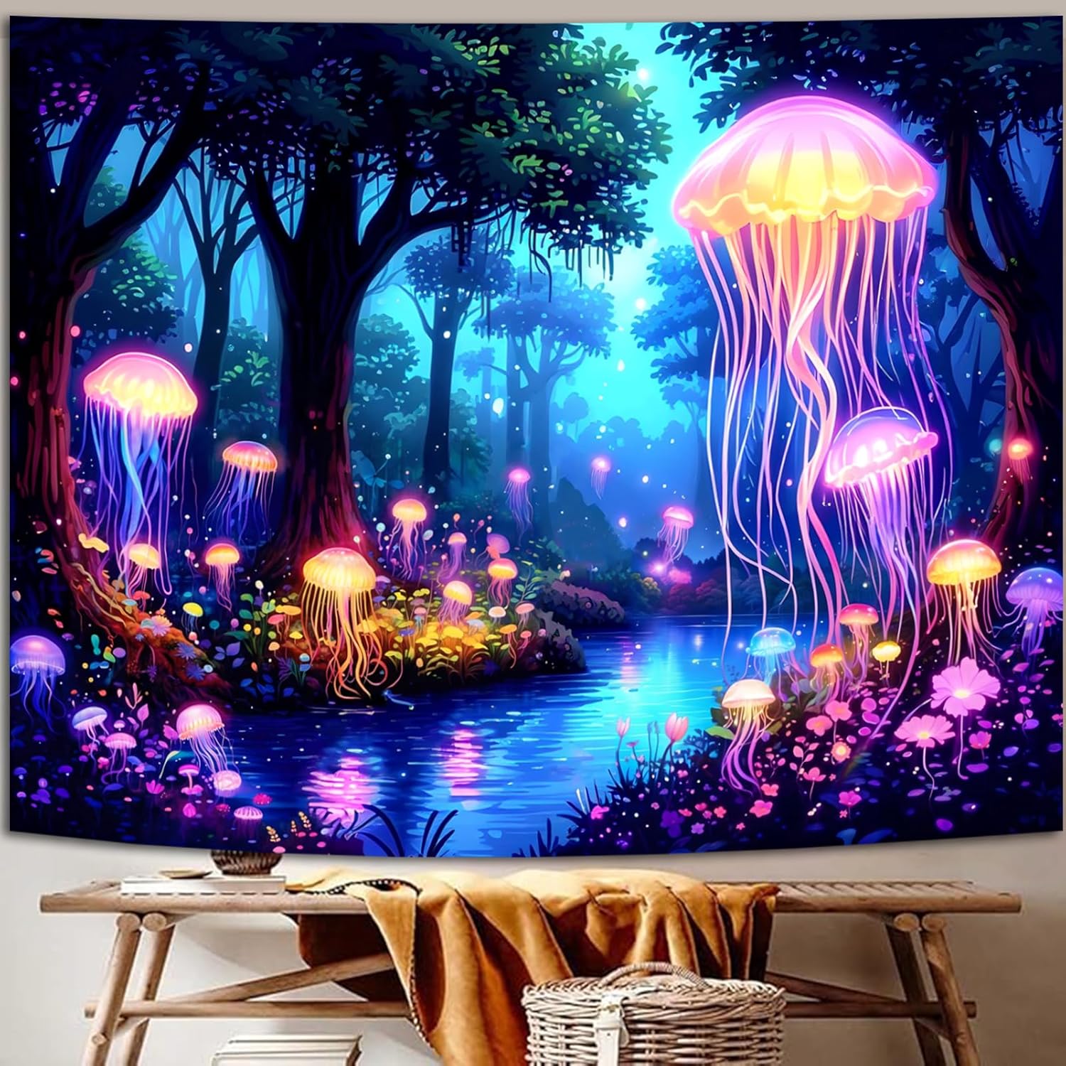 Manicer Blacklight Jellyfish Forest Tapestry – UV Reactive Fantasy Underwater Jellyfish in Enchanted Forest, Glow in the Dark Neon Nature Art Wall Hanging for Bedroom, Living Room – 51.2" x 59.1"
