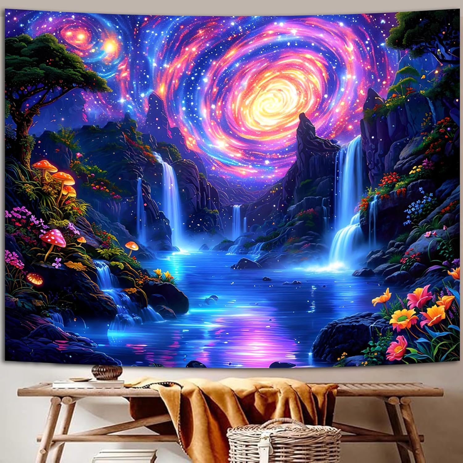 - π UV Reactive Cosmic Design β Comes alive under blacklight! The glowing galaxy sky, waterfalls, and mushrooms radiate brilliant neon colors in the dark, perfect for parties, gaming rooms, or a relaxing night vibe.
