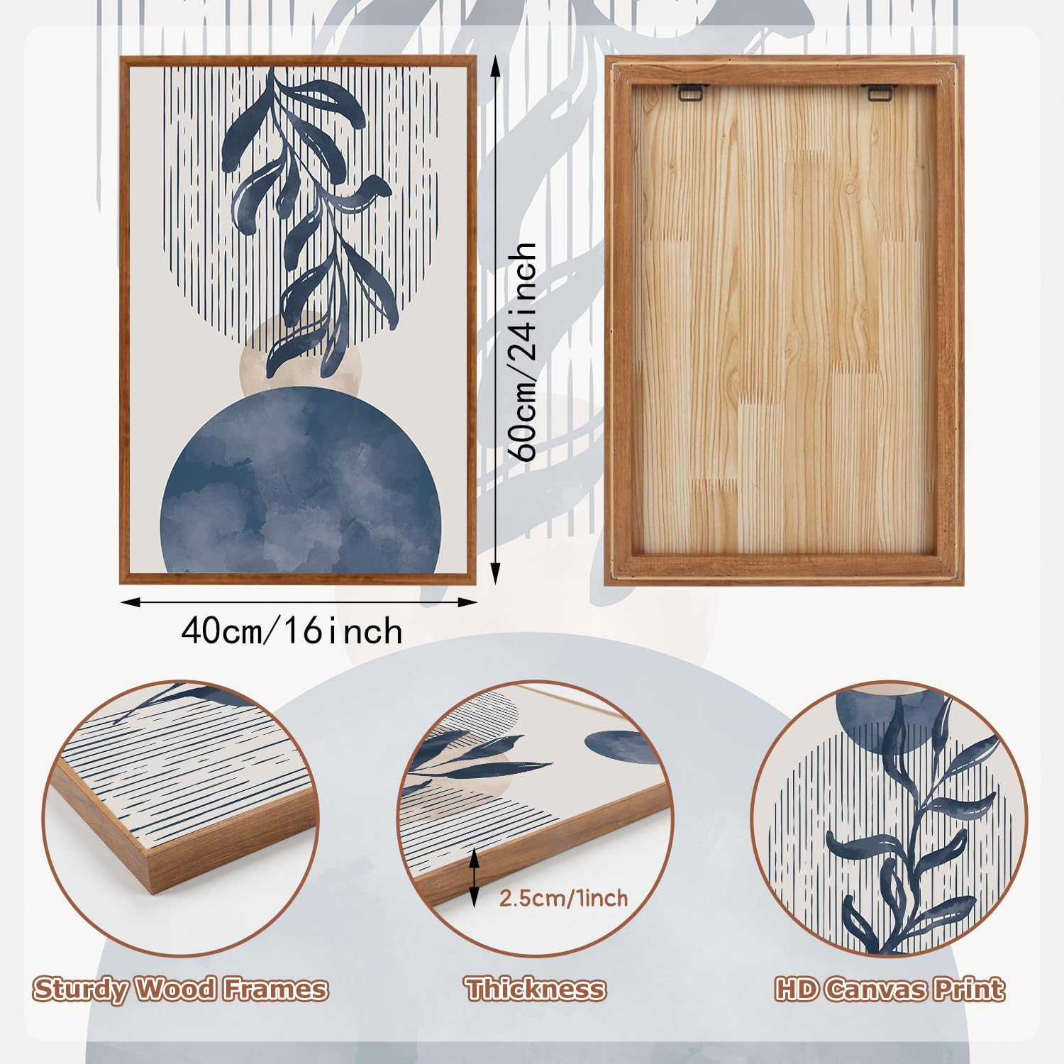 KAIRNE Boho Plant Wall Art Set of 3,Blue Bohemain Framed Canvas,Abstract Geometric Line Wall Painting,Modern Nature Prints,Botanical and Moon Wall Art for Living Room Bedroom Office - 3Pieces,16”X24”