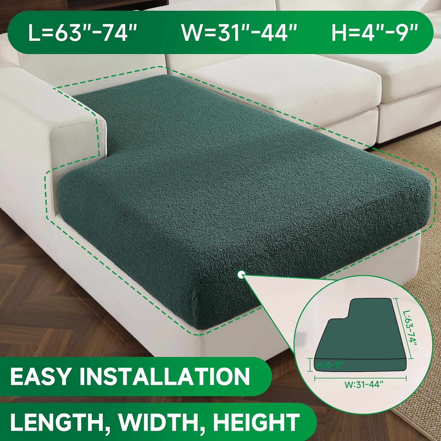 - 1.WHAT YOU WILL GET: 1*Chaise Cushion Cover. Suitable for sofa cushions with Length: 63-74 inches, Width: 31-44 inches, Height: 4-9 inches.This sectional couch cover is tailor-made for your sofa and can effectively resist stains, dust, pet hair and daily wear and tear.Made of soft Polar Fleece fabric, it adds a cozy and warm touch to your seat.