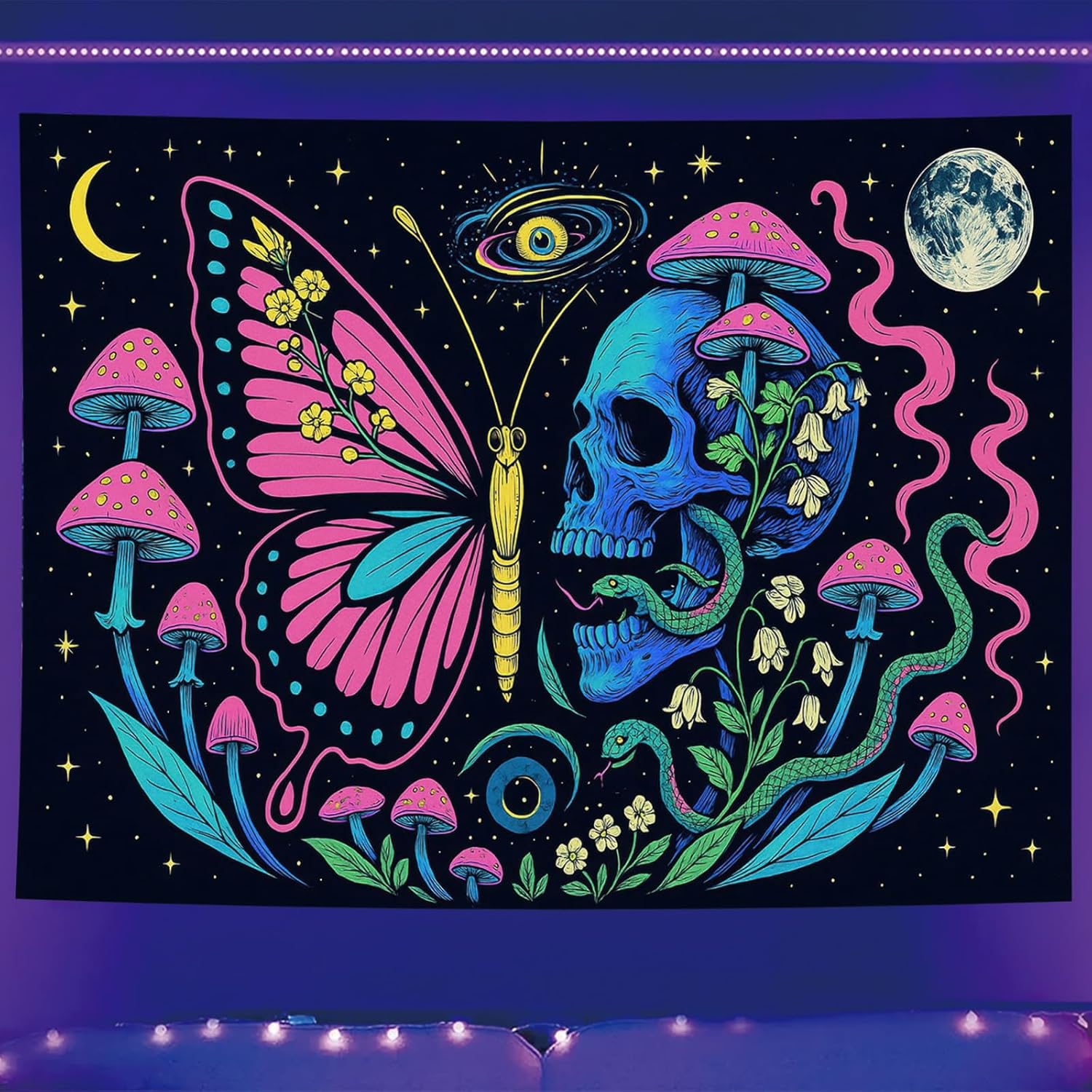 - Symbolic Psychedelic Design:This blacklight tapestry features a cosmic butterfly facing a skull surrounded by mushrooms snakes and stars creating a mystical and surreal aesthetic perfect for dark rooms.