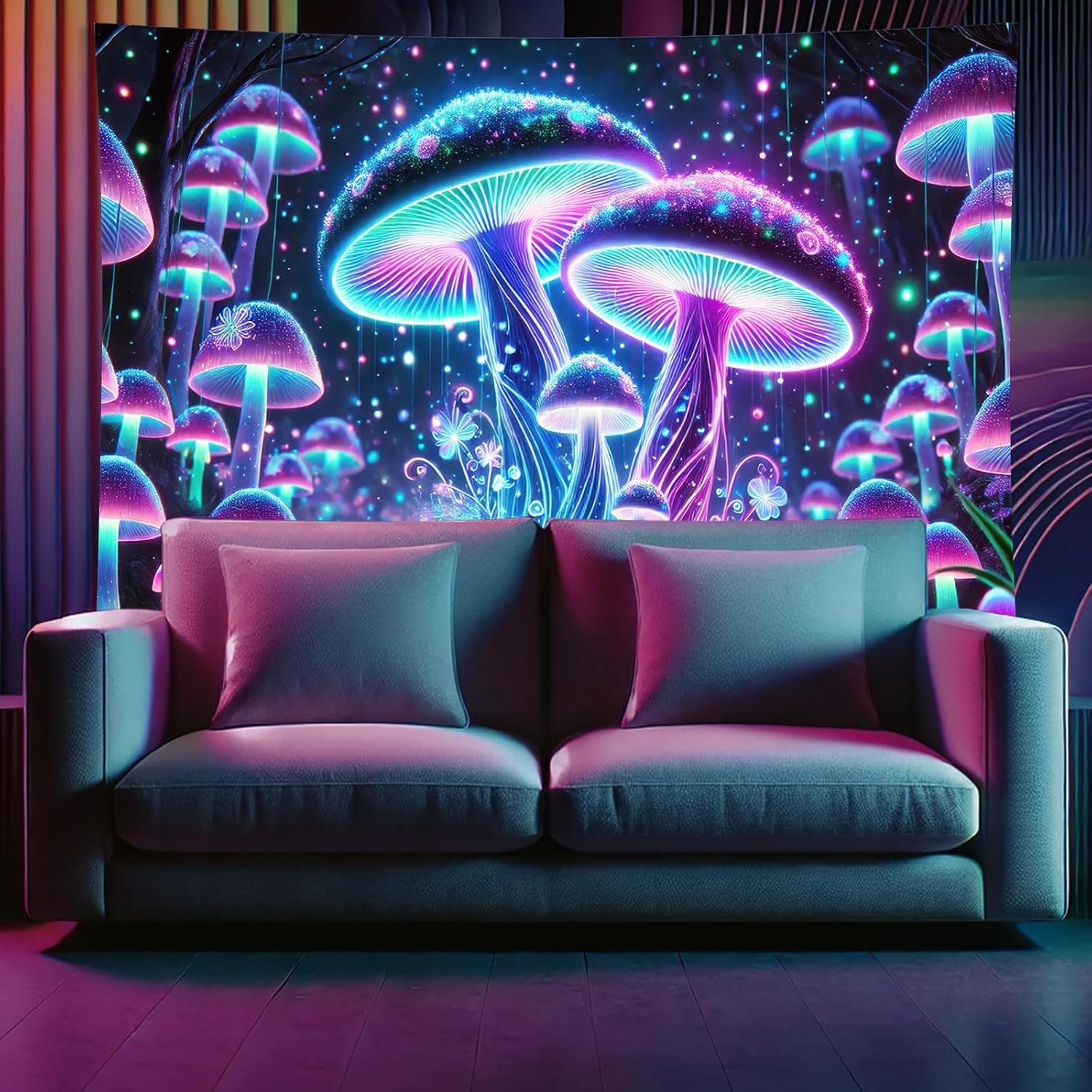 - Psychedelic Mushroom Design:This blacklight mushroom tapestry features a glowing fantasy forest scene that brings a surreal psychedelic style to your bedroom wall or dorm decor under UV light.