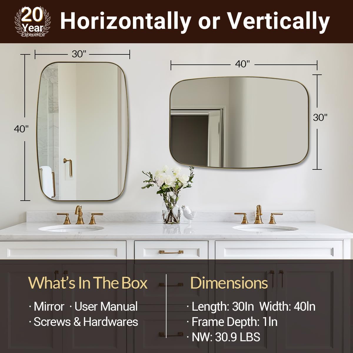 - Versatile Design for Medium Spaces: Enhance your medium-sized bathroom with the 30 x 40 inch mirror; balanced proportions and high-quality construction offer versatility; allows for vertical or horizontal installation to suit your style and space needs