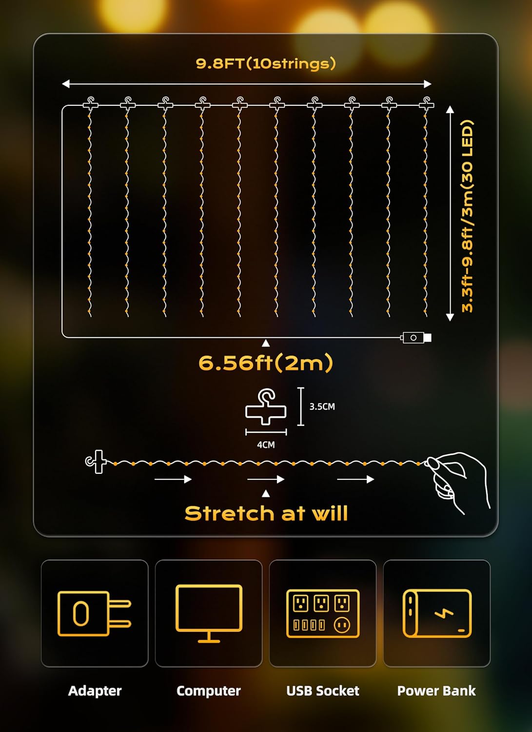 - [300 LED Curtain String Lights] (Curtain is NOT included) (Hook size: 3.5cm×4cm) 300 individual LEDs, 9.8ft x 9.8ft Led Curtain Lights , made of copper wire, soft texture, can be cut freely without affecting the rest, so you can DIY any decoration you like.Copper wire drop strings is tough and flexible, hanging and adjustable desired height naturally easily; No limits to your imagination, Do the shape you like; Enjoy a fairytale world