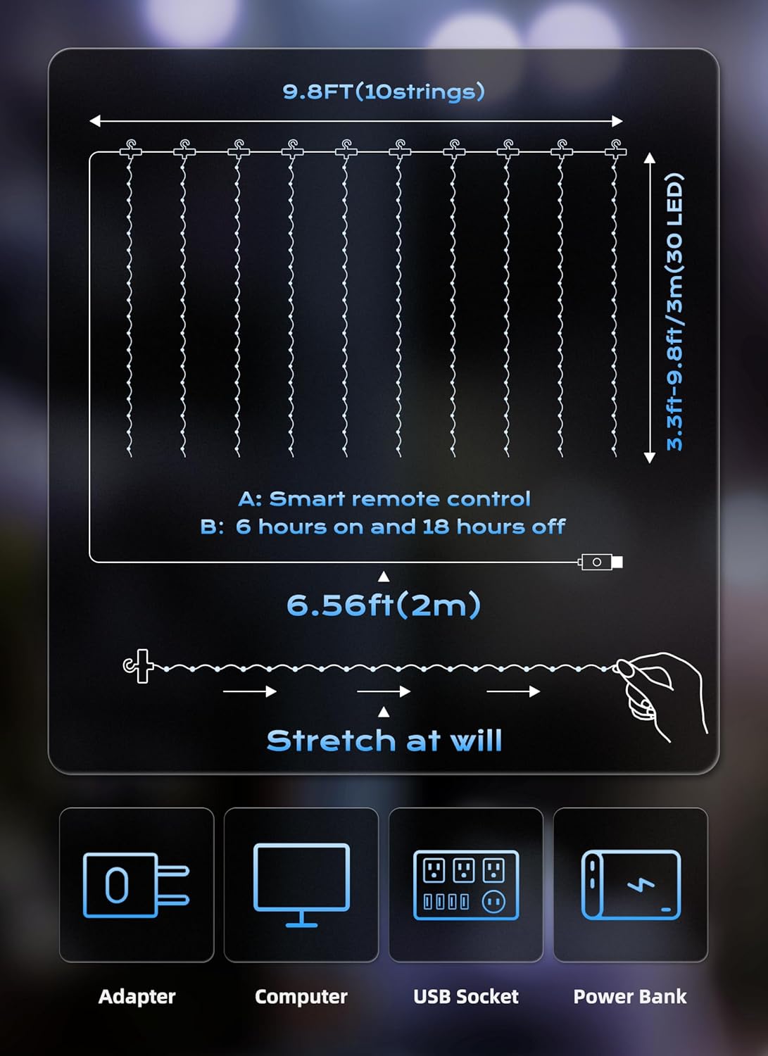 - [Safety & Decoration] Operated with 5V low voltage, our fairy curtain lights glow with low heating, and it is safe to touch; It can be safely hung on the curtains or on the wall. It is a wonderful decor for dorm, college, bedroom, party, birthday, wedding, Christmas, New Year, indoor, outdoor, classroom, Winter Wonderland Decorations