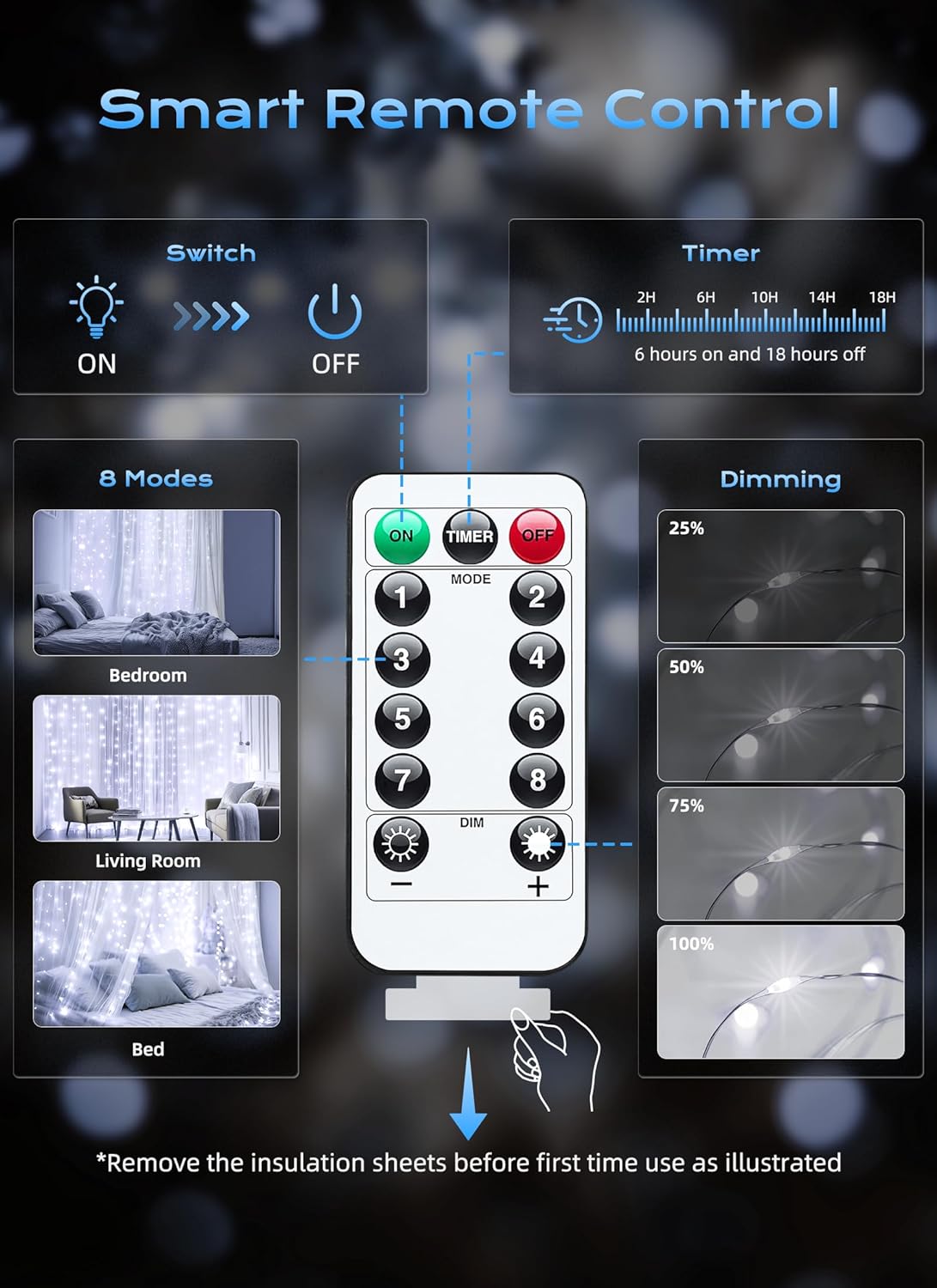 - [Timer & Remote] We can use the remote control to timing for 6 hours on and 18 hours off. What's more, the brightness of our curtain lights is adjustable of 20% 40% 60% 80% 100%