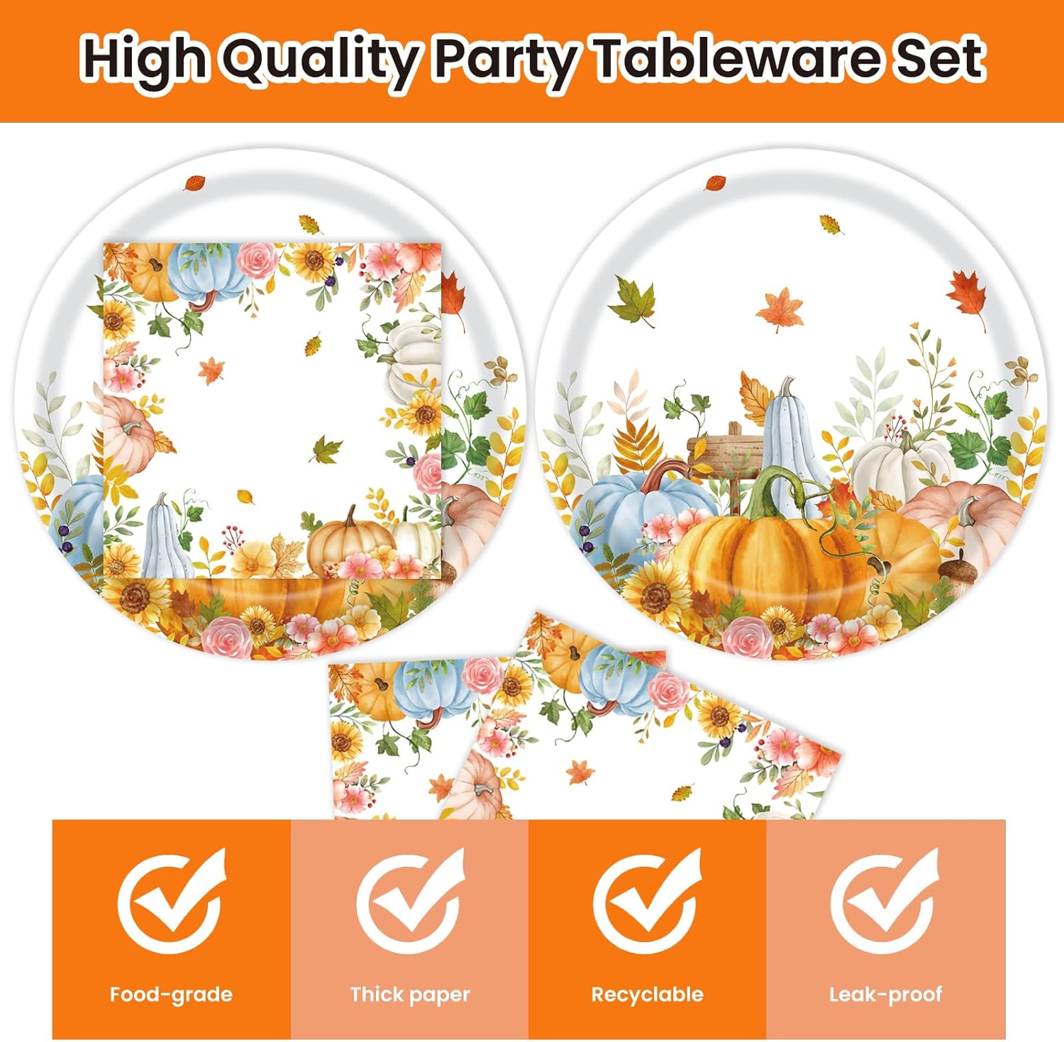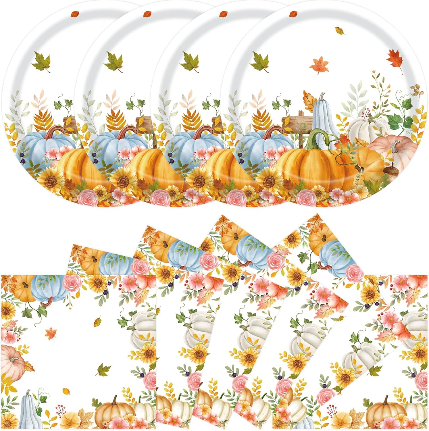 40Pcs Fall Paper Plates and Napkins Party Supplies, Disposable Thanksgiving Pumpkin Flower Wreath Plates Napkins Dinnerware Set for Autumn Theme Party Decorations (Fall)