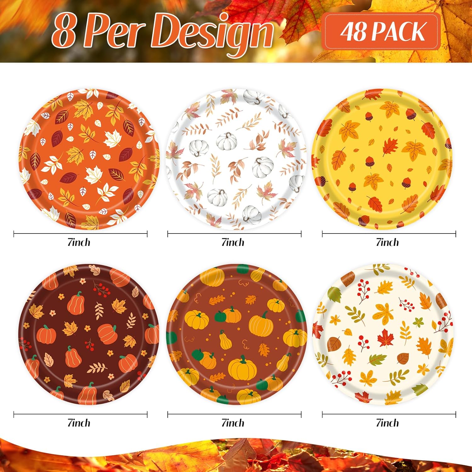 - ๐ใPackage Includesใ You'll receive 48 festive fall-themed paper plates, perfect for autumn gatherings. Each set features 6 unique designs, with 8 plates per design, adding variety to your table setting.