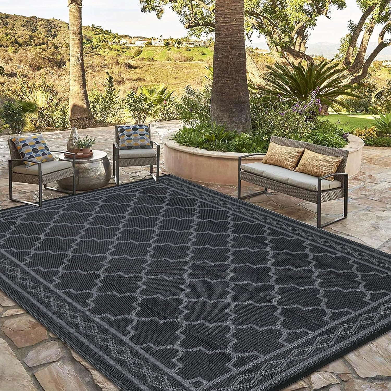 GAOMON Outdoor Rug Waterproof 8'x10', Reversible Outdoor Plastic Straw Rug, Boho Patio Rug, Indoor Outdoor Carpet, RV Mat Outside for Patio, Camp, Picnic, Balcony, Deck, Black/Grey(Geometric)