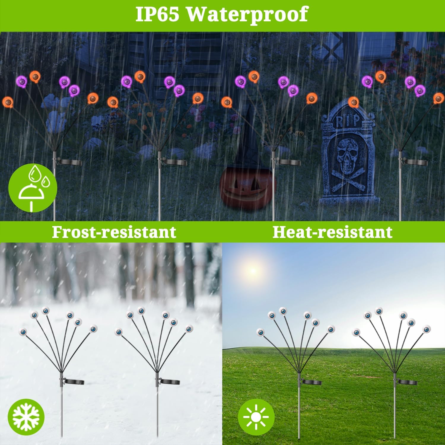 - Easy to Assemble & Widely Used: The outdoor solar lights just need insert the eyeball, then connect the rod and ground spike. They can be used in garden, yard , courtyard, path, lawn, terrace, and other places, it's the perfect choice for outdoor halloween decorations.