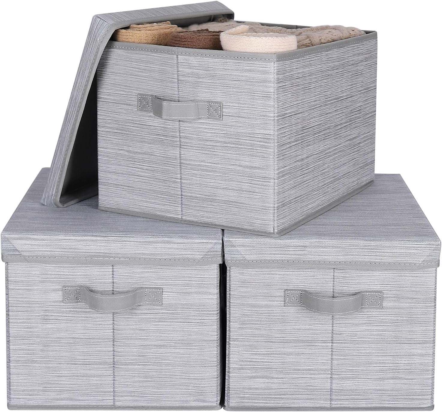 WUIKE 3 Pack Extra Large Closet Storage Bins with Lids, Gray Storage Boxes with Handles, Fabric Storage Baskets with Cover for Bedroom
