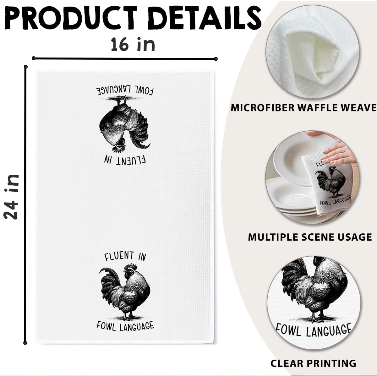 Chicken Dish Towel, Waffle Weave Microfiber Kitchen Cloth, Rustic Rooster Decor Accent, Farmhouse Style Gift for Chicken Lovers, Funny Country Hand Towel for Kitchen Bathroom - A05