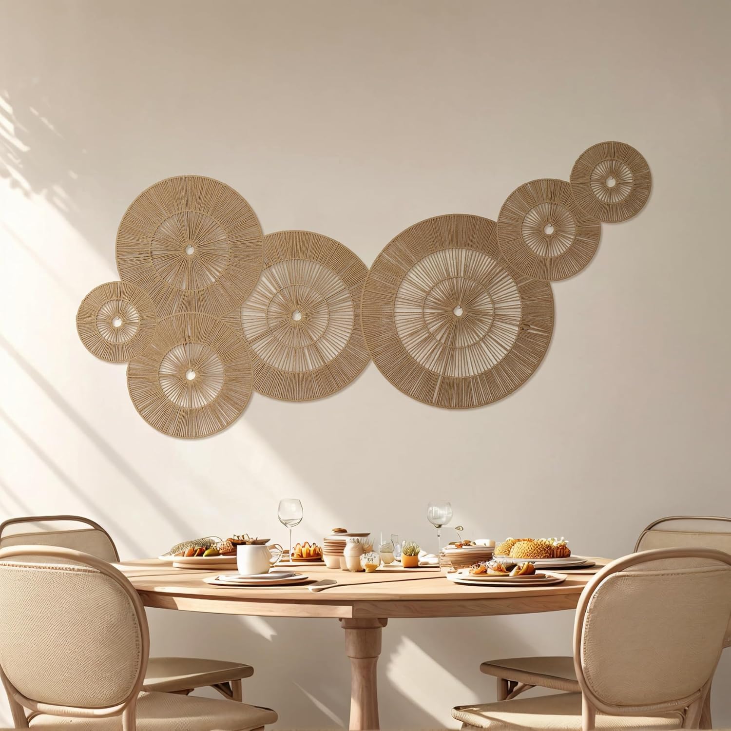 Mokof 7 Pack Boho Wall Decor Round Baskets Set (Small 7" to Largest 17") - Handwoven Large Wall Hanging Art for Bedroom, Living Room, Home Office
