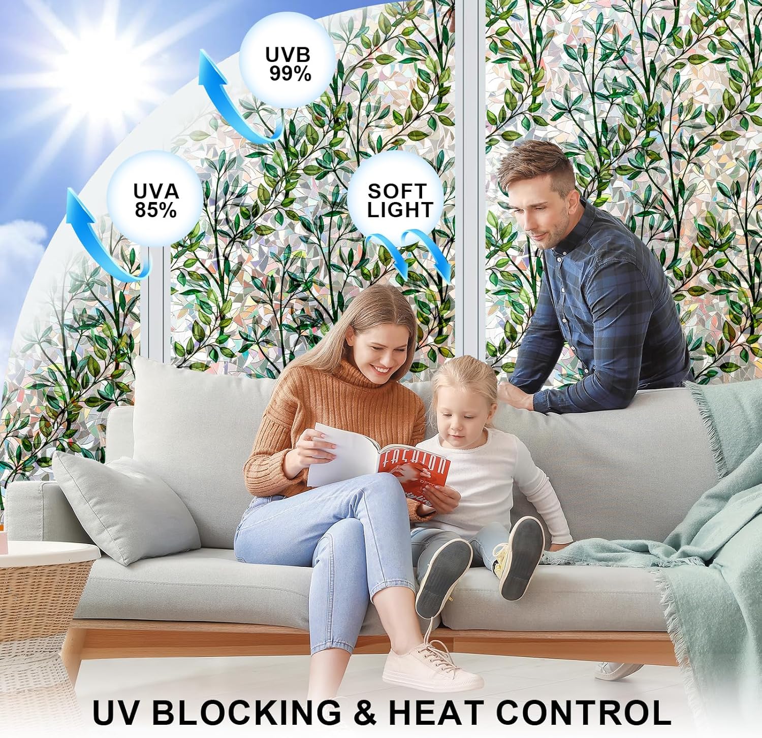 Rainbow Window Privacy Film 3D Leaf Decorative Stained Glass Window Film Anti UV Non-Adhesive Reusable 23.6" x 78.7" for Home Room Car Glass Cling