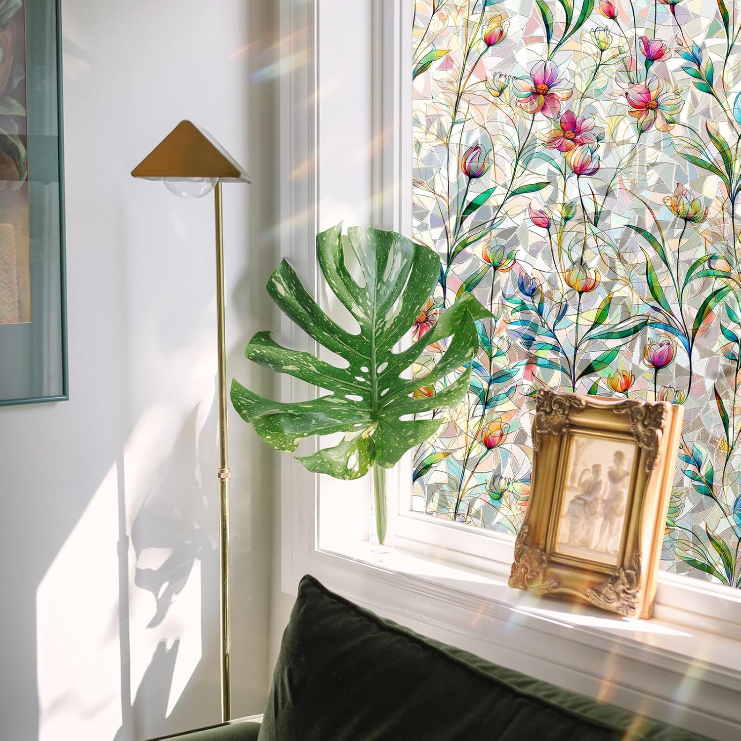 Rainbow Window Privacy Film 3D Floral Decorative Stained Glass Window Film Anti UV Non-Adhesive Reusable 23.6" x 157.4" for Home Room Car Glass Cling
