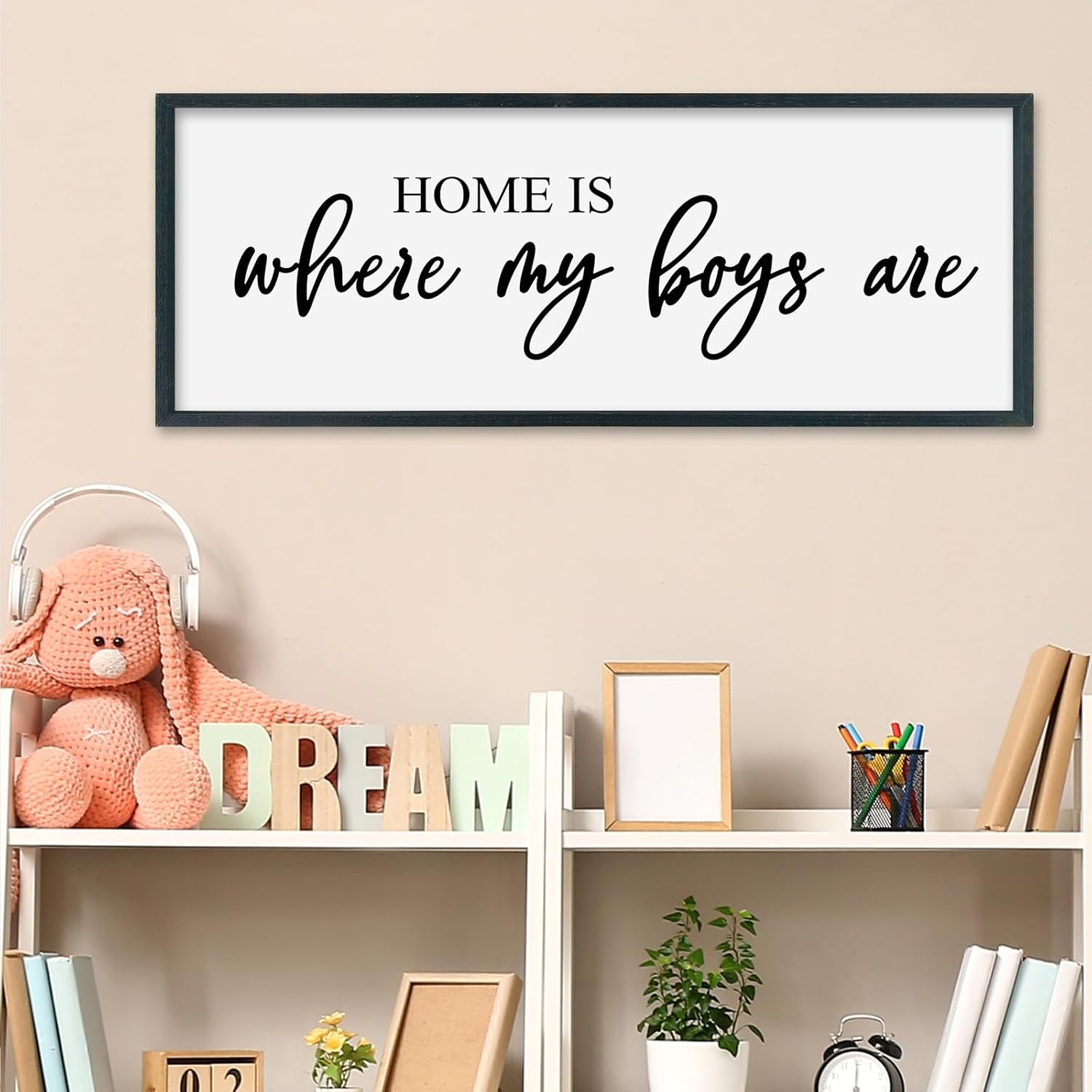 SRSZHIYUE Home Is Where My Boys Are Sign 32"×12" New Mothers Day Gifts ideas Wall Art for kids Playroom Mom Quote Bedroom Large Wood Framed Wall Hanging Decor (Black)
