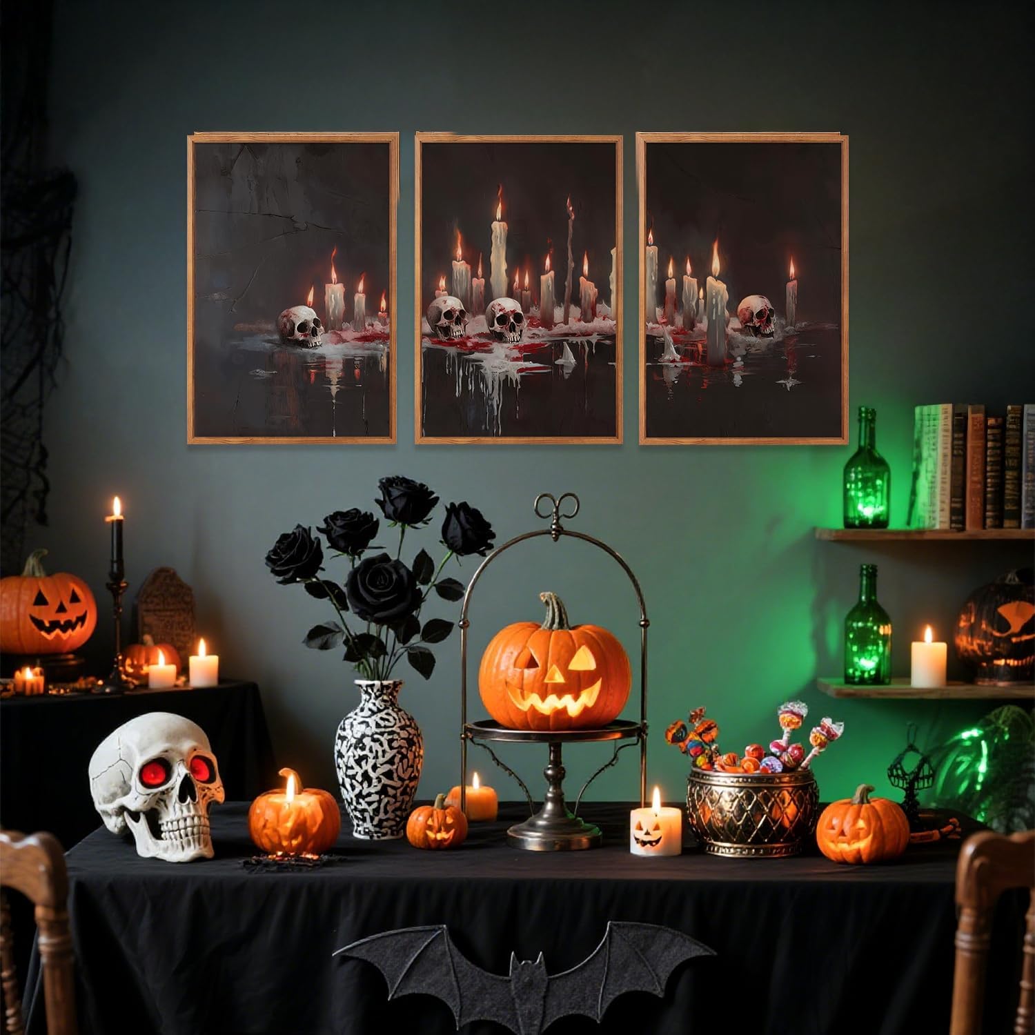 Aurlan Gothic Bloody Skull and Candles Framed Wall Art(16"x24"), 3PCS Horror Dark Academia Halloween Skeleton Canvas Artwork, Modern Goth Spooky Creepy Ghost Decor for Home Office Bedroom